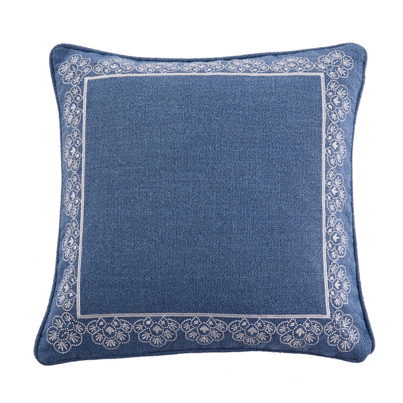 The Embroidered Border decorative pillow matches perfectly with the Levtex Home Apolonia bedding collection. This pillow is sized at 18 x 18 in. and features an intricate, detailed white border embroidered on a textured blue ground. The color palette makes this a versatile accessory for your bed, couch or favorite chair. The pillows comes pre-filled with a soft luxurious feather inner.