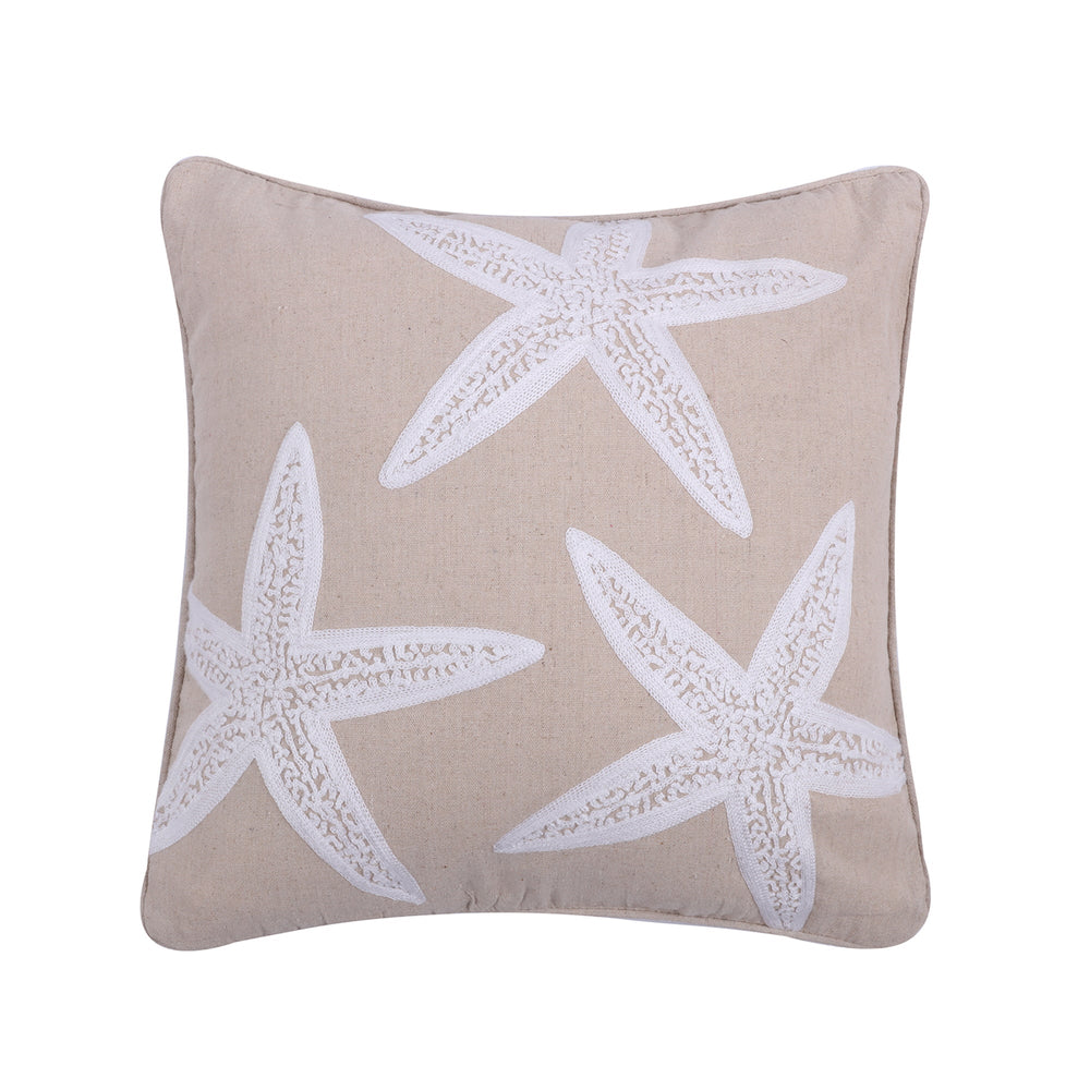 The ‘Crewel Starfish’ pillow adds a classic coastal accent to any bedroom or living space. This pillow is sized at 18x18in. and features beautifully detailed white crewel-stitched starfish on natural ground. The pillow comes pre-filled with a soft, luxurious feather inner. The inner is removable, assuring easy care if the pillow cover needs cleaning.