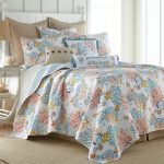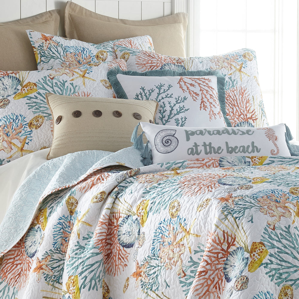 The Bay Islands Reversible Quilt Set by Levtex Home is inspired by the colors of a coral reef. Offered in shades of coral, teal, gold and taupe, this design will immediately transform your bedroom. Made with the softest lightweight cotton, this reversible quilt features a colorful coastal collection of coral and shells on the one side, reversing to a light blue gate pattern on cream on the other. The Quilt Set has a cotton rich filler (90% cotton, 7% rayon, 3% other fibers) and is machine washable. Enjoy this for years to come!