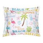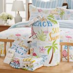 The Beach Days Duvet Cover/Comforter Set by Levtex Home is fun, beachy elements. Offered in teal, blue, yellow, green, brown and pink, this design will immediately transform your bedroom. Made with a soft and luxurious cotton, this duvet cover/comforter set features a fun beach print. It has beach motifs, flamingos, palm trees and fun words on the front and a teal blue and white stripe on the reverse. The Duvet Cover closes with easy to use, durable buttons. The Beach Days Duvet Cover/Comforter Set is machine washable. Enjoy this for years to come!