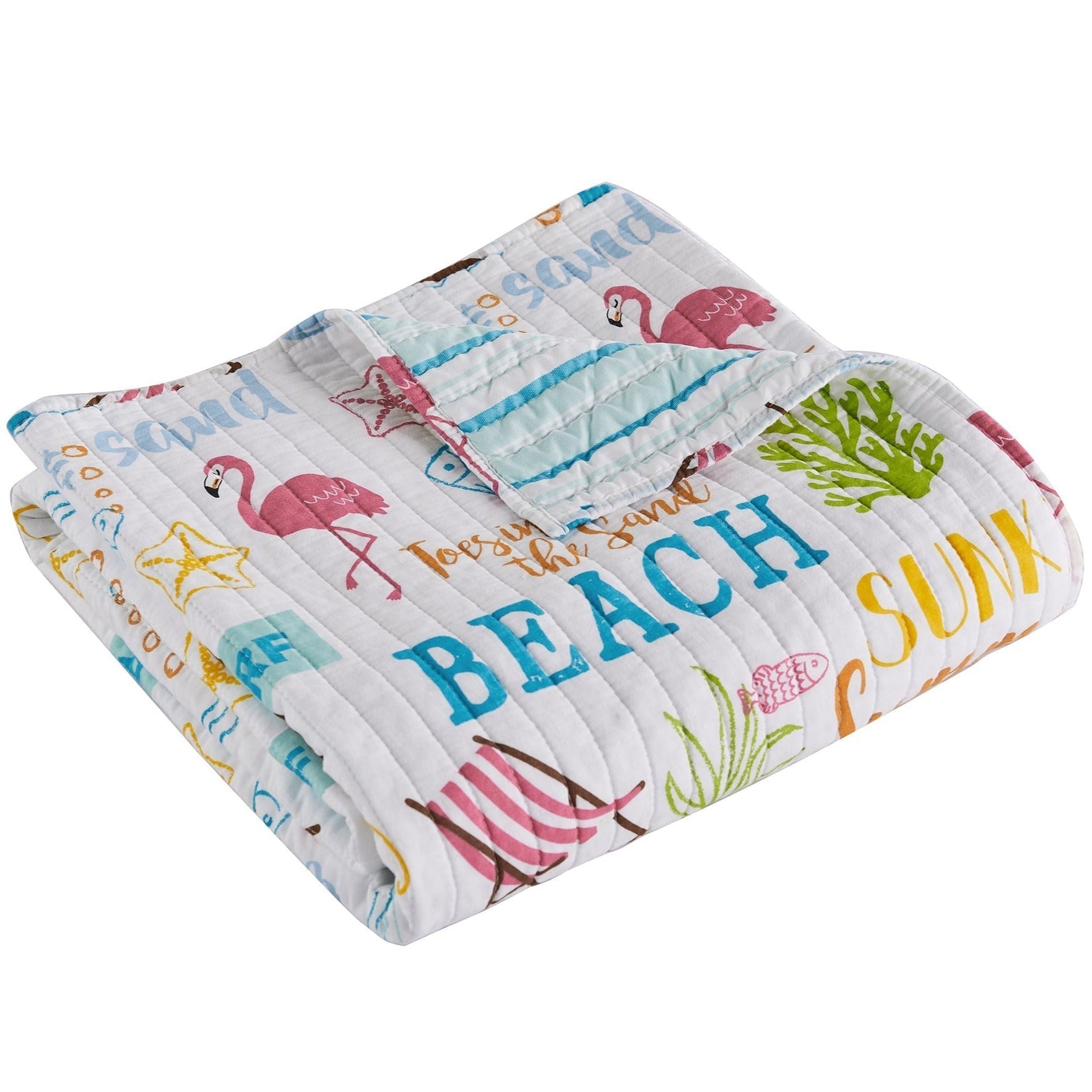 The Beach Days Reversible Quilted Throw Quilt Set by Levtex Home is inspired by Summer days at the beach. Offered in shades of teal, blue, yellow, green, brown and pink, this design will immediately transform your bedroom. Made with the softest lightweight cotton, this reversible quilt features beach motifs, flamingos, palm trees and fun words on the one side, reversing to a teal blue and white stripe on the other. The Quilted Throw is perfectly sized at 50x60in.; it has a cotton rich filler (90% cotton, 7% rayon, 3% other fibers) and is machine washable. Enjoy this for years to come!