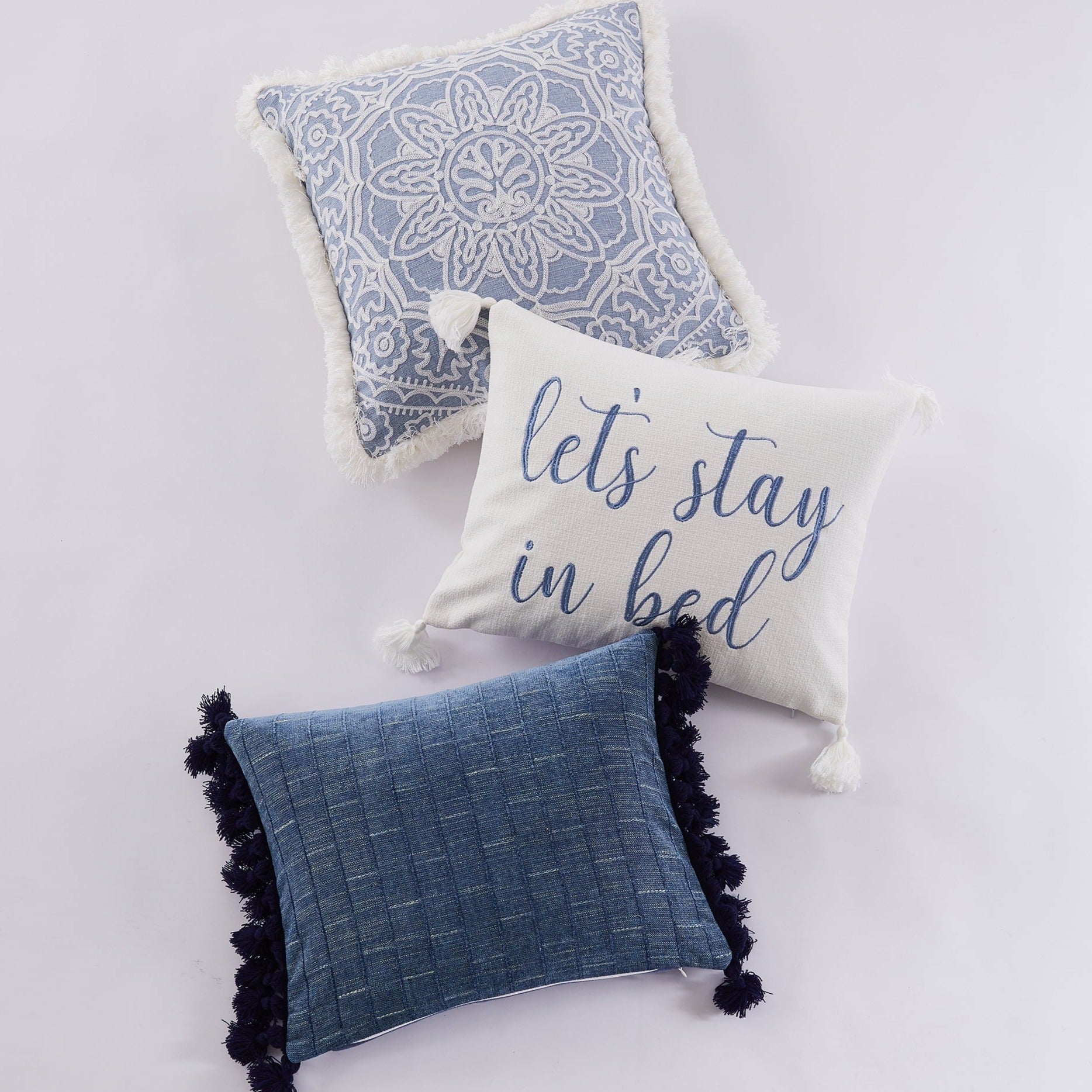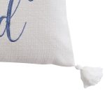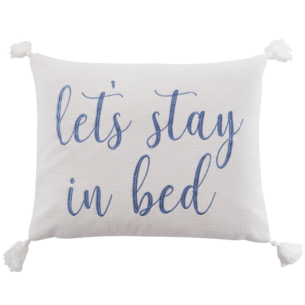 The Stay in Bed decorative pillow matches perfectly with the Levtex Home Bennett bedding collection. This pillow is sized at 14 x 18in. and features the words STAY IN BED embroidered in blue on a slub white ground and finished with white tassels in each corner. The color palette makes this a versatile accessory for your bed, couch or favorite chair. The pillow comes pre-filled with a soft luxurious feather inner.