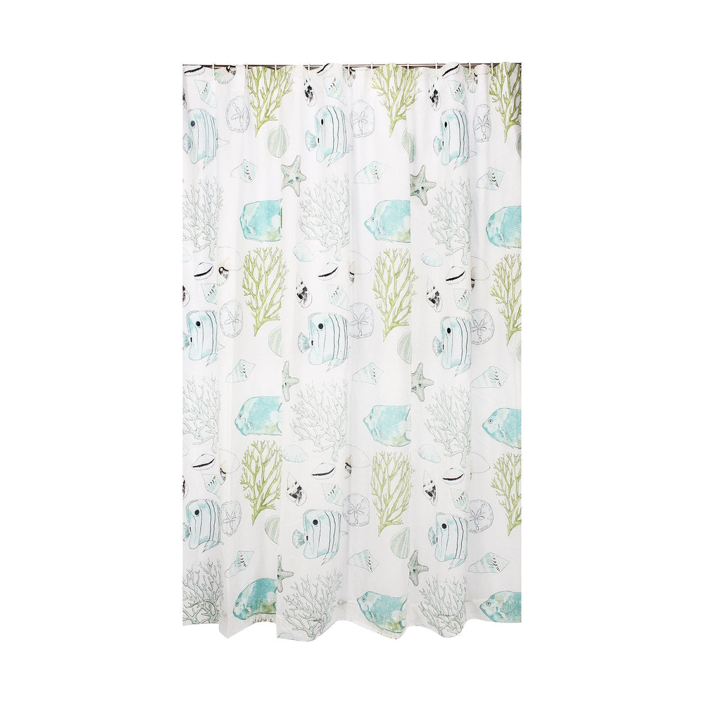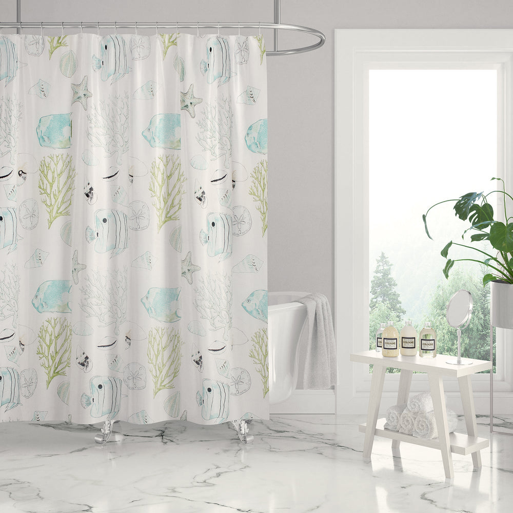 - The Biscayne Reversible Shower Curtain (72x72in.) by Levtex Home is inspired by sealife you may see on a coral reef. Offered in shades of teal, green, blue, and white, this design will immediately transform any bathroom. Made with 100% cotton on one side and polyester on the other, this shower curtain features tropical fish, coral, and seashells on white ground. The shower curtain is machine washable and does not include any hardware or waterproof liner. Enjoy this for years to come!