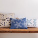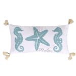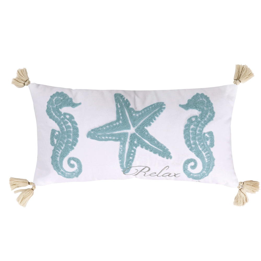 The Relax Starfish decorative pillow matches perfectly with the Levtex Home Blue Bay bedding collection. This pillow is sized at 12x24in. and features two blue seahorses and a starfish, along with the word RELAX, on white ground. Natural color tassels adorn each of the corners. The white, seafoam blue and taupe color palette makes this a versatile accessory for your bed, couch or favorite chair. The pillows comes pre-filled with a soft luxurious feather inner.
