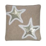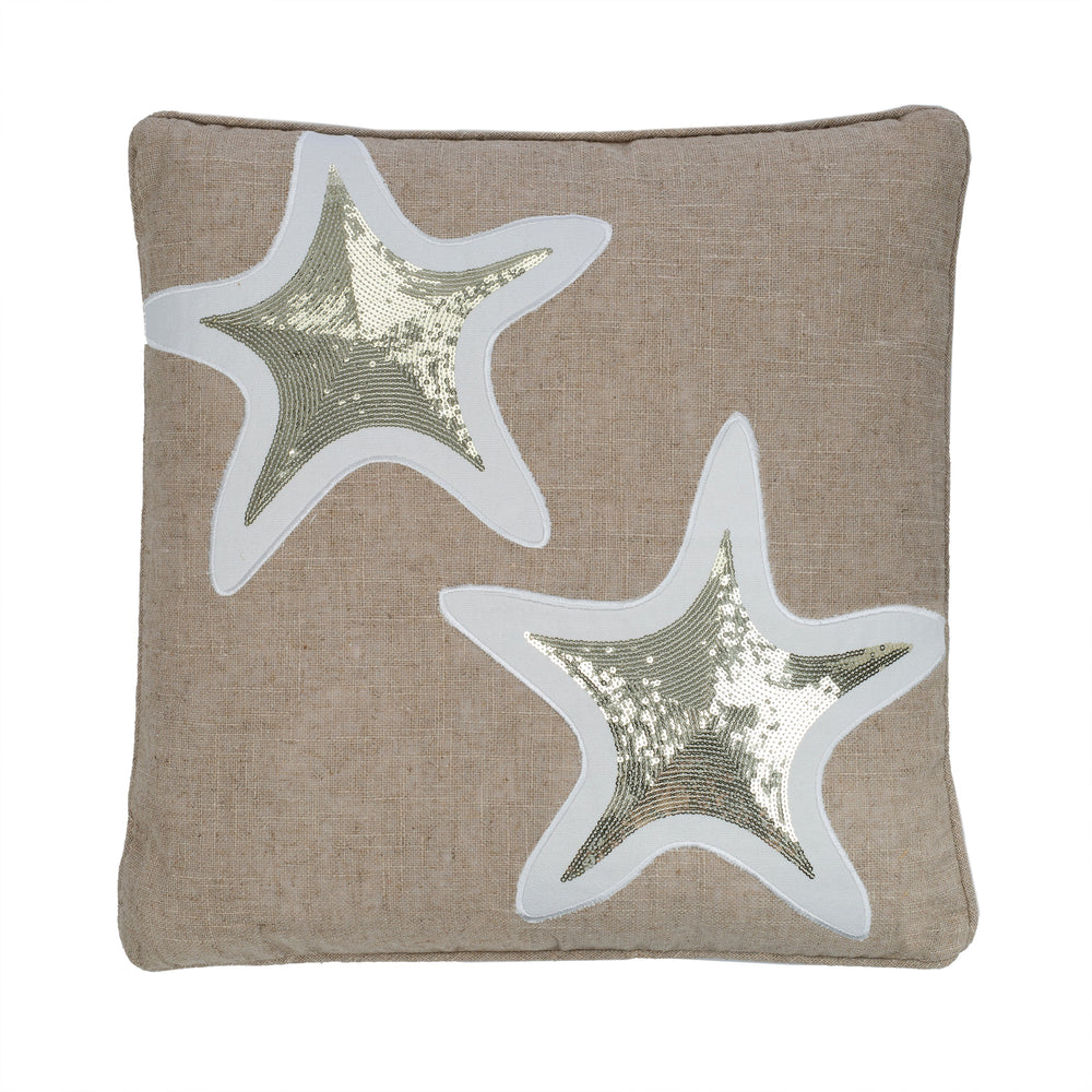 The Appliqued Starfish decorative pillow matches perfectly with the Levtex Home Blue Maui bedding collection. This pillow is sized at 18 x 18in. and features two gold sequin starfish appliqued against a natural tan burlap ground. The color palette makes this a versatile accessory for your bed, couch or favorite chair. The pillow comes pre-filled with a soft. luxurious feather inner.