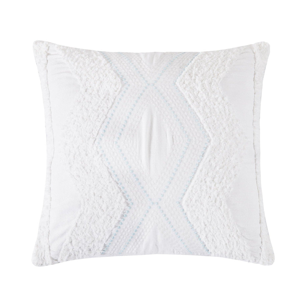 The Tufted Chevron decorative pillow matches perfectly with the Levtex Home Blue Sea bedding collection. This pillow is sized at 18 x 18in. and features a chevron pattern in tufted cream chenille with teal embroidered accents. The color palette makes this a versatile accessory for your bed, couch or favorite chair. The pillows comes pre-filled with a soft luxurious feather inner.
