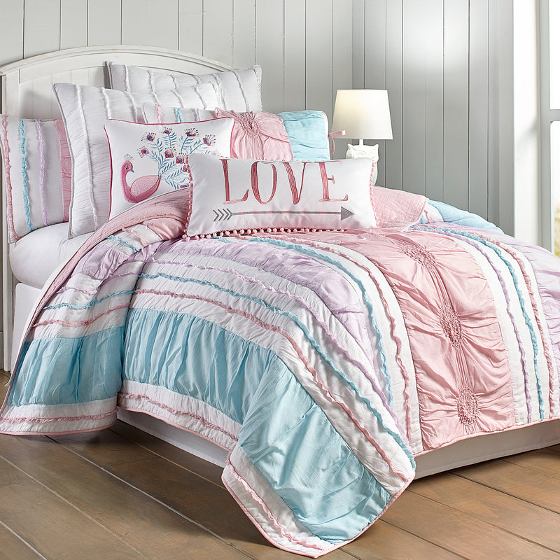 The Bobbi Reversible Kids Quilt Set by Levtex Home is inspired by elegant ball gowns. Offered in pink, lavender and purple, this design will immediately transform your kid’s bedroom. This reversible quilt features a pink ruched stripe down the center with lavender and teal stripes and ruffles on either side on the front, reversing to a plain pink quilt on the back. The Quilt has a cotton front and back, filled with a cotton-rich filler, and are machine washable. Your child will enjoy this for years to come!