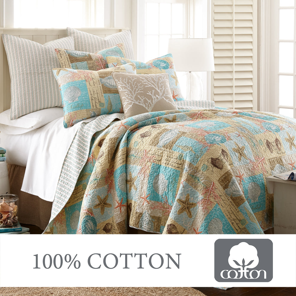 The Bridgetown Reversible Quilt Set by Levtex Home is inspired by antique sketches of beautiful sealife. This coastal printed patchwork design will immediately transform your bedroom. Made with the softest lightweight cotton and filled with a cotton-rich filler (that includes cotton, polyester and other fibers), this reversible quilt features a patchwork of coastal elements, reversing to a cream, teal and taupe stripe on the other. The Quilt Set is machine washable. Enjoy this for years to come!