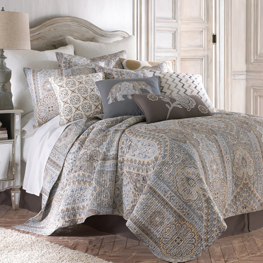 The Casablanca Reversible Quilt Set by Levtex Home is inspired by historical wood carvings and tapestries. Offered in shades of grey, taupe and cream, this design will immediately transform your bedroom. Made with the softest lightweight cotton, this reversible quilt features a rich pattern of damasks and medallions in a handsome, subtle palette. The Quilt Set has a cotton rich filler (90% cotton, 7% rayon, 3% other fibers) and is machine washable. Enjoy this for years to come!