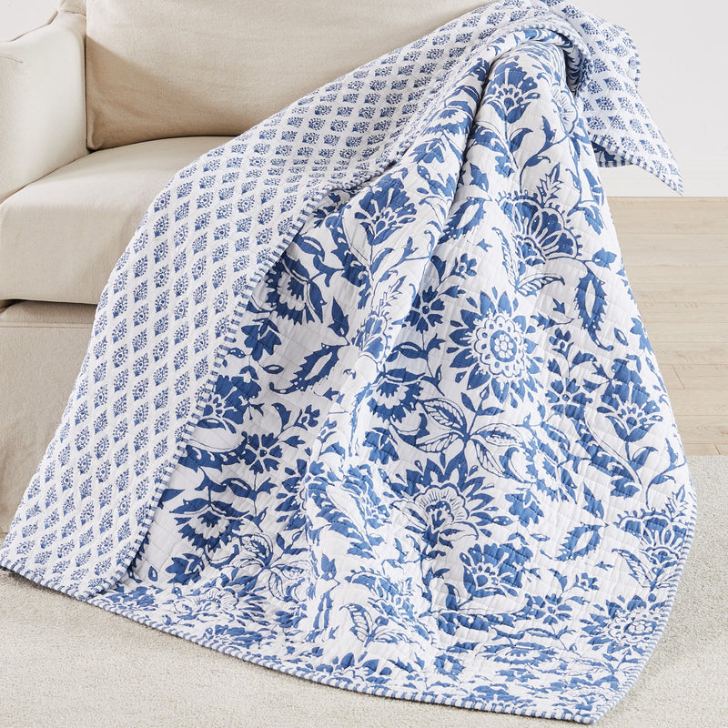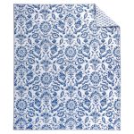 The Clara Blue Reversible Throw by Levtex Home is inspired by antique chic wallcoverings. Offered in classic blue and white, this design will immediately transform any room in your home. This throw features an array of flowers and vines on the front, reversing to a small blue geometric medallions on white on the back. The Throw (50x60in.) has a cotton front and back, filled with a cotton-rich filler, and is machine washable. Enjoy this for years to come!