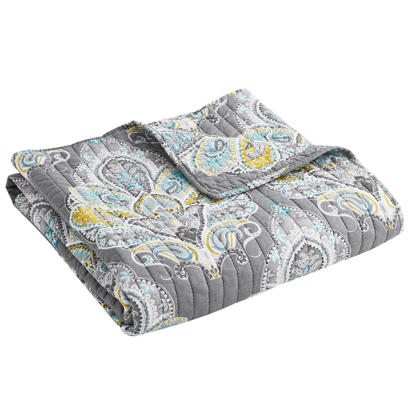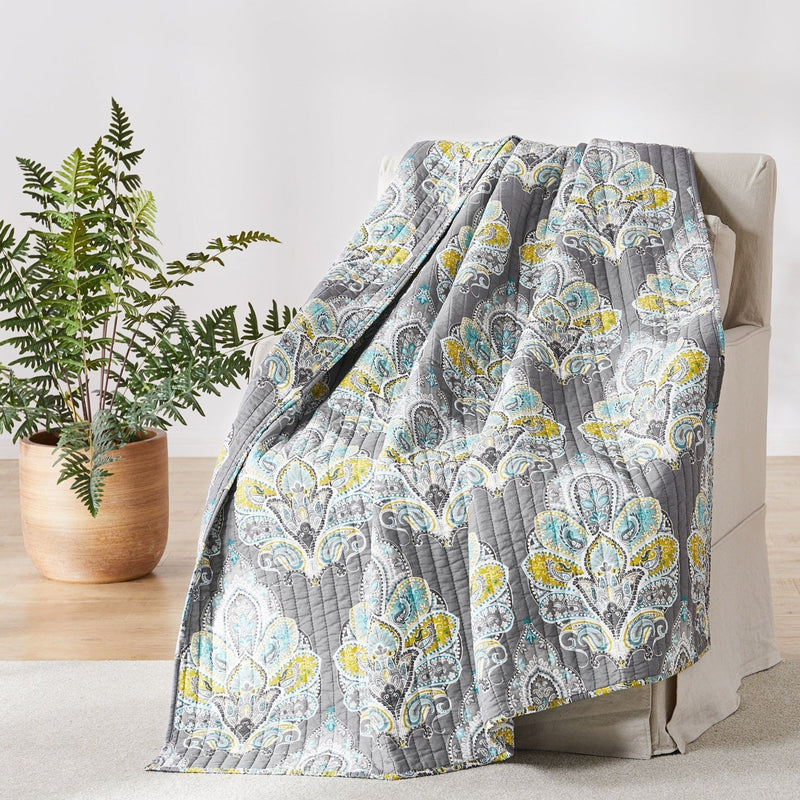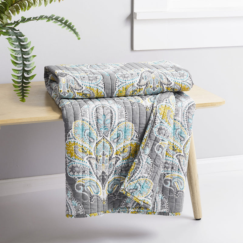 The Cressley Quilted Throw by Levtex Home is inspired by antique patterns and fabrics. This intricate paisley medallion design will immediately transform your bedroom. Made with the softest lightweight cotton, this throw features a oversized medallions ascending from the bottom of the quilt in vibrant colors, reversing to the same pattern on the other. The Quilted Throw is perfectly sized at 50x60in., is machine washable and is filled with a cotton-rich filler (that includes cotton, polyester and other fibers). Enjoy this for years to come!