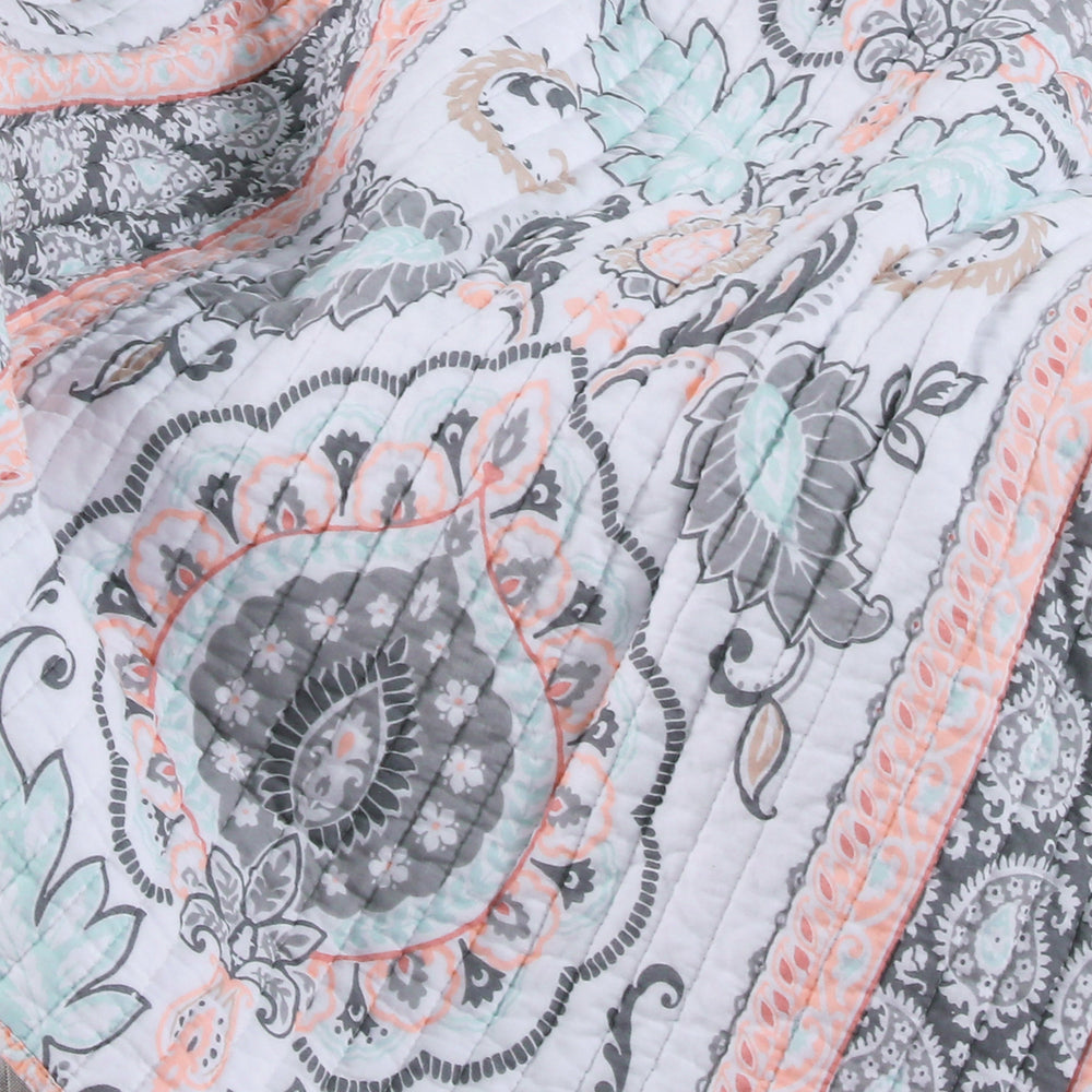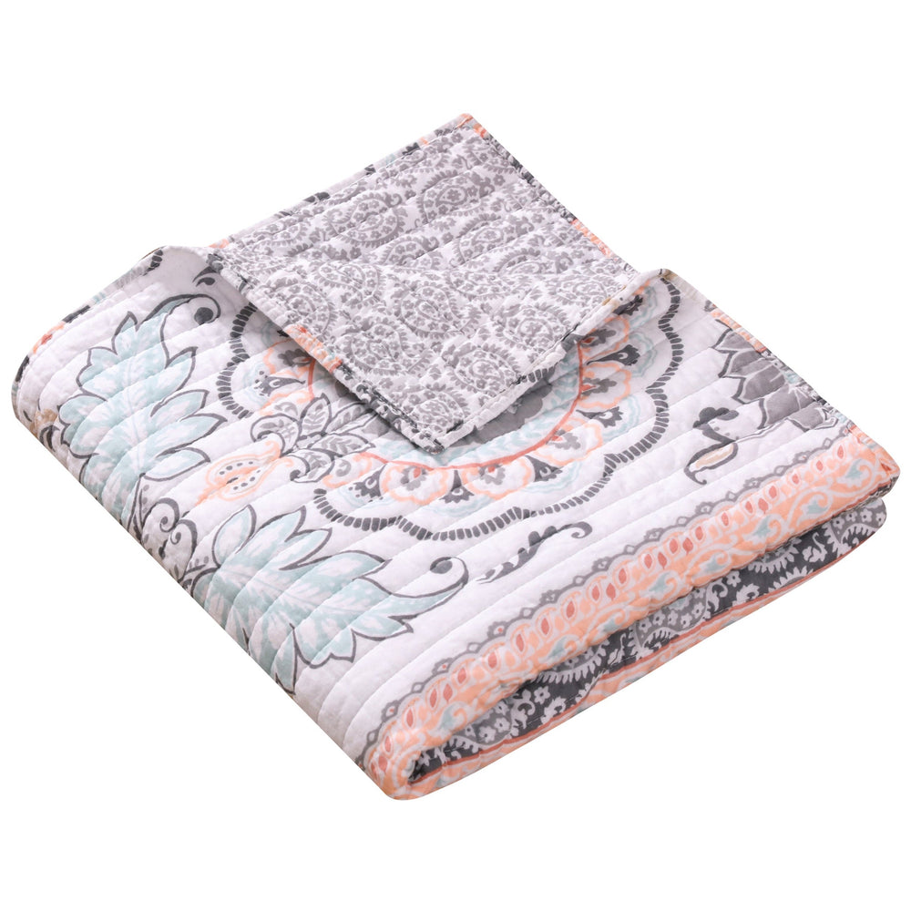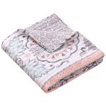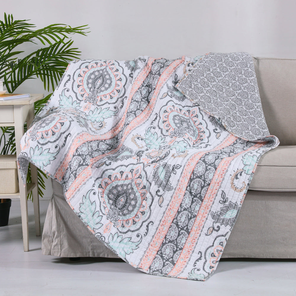 The Darcy Reversible Quilted Throw by Levtex Home is inspired by bohemian style. This floral paisley design will immediately transform your bedroom. Made with the softest lightweight cotton, this reversible throw features a floral paisley design in blush, grey, and mint, reversing to a micro paisley in grey and white on the other. The Quilted Throw is perfectly sized at 50x60in., is machine washable and is filled with a cotton-rich filler (that includes cotton, polyester and other fibers). Enjoy this for years to come!
