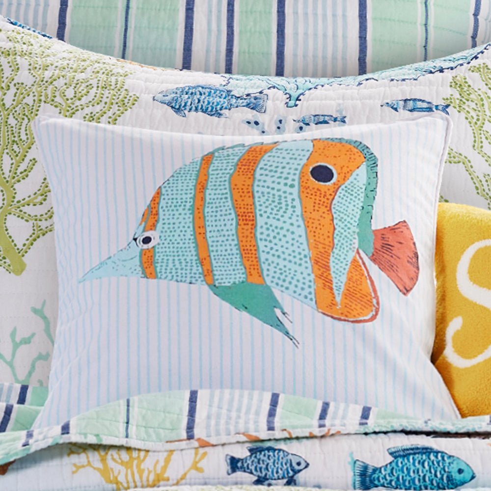 The Printed Fish decorative pillow matches perfectly with the Levtex Home Deep Sea bedding collection. This pillow is sized at 18 x 18in. and features cute printed fish on a white with teal striped ground. The color palette makes this a versatile accessory for your bed, couch or favorite chair. The pillow comes pre-filled with a soft, luxurious feather inner.