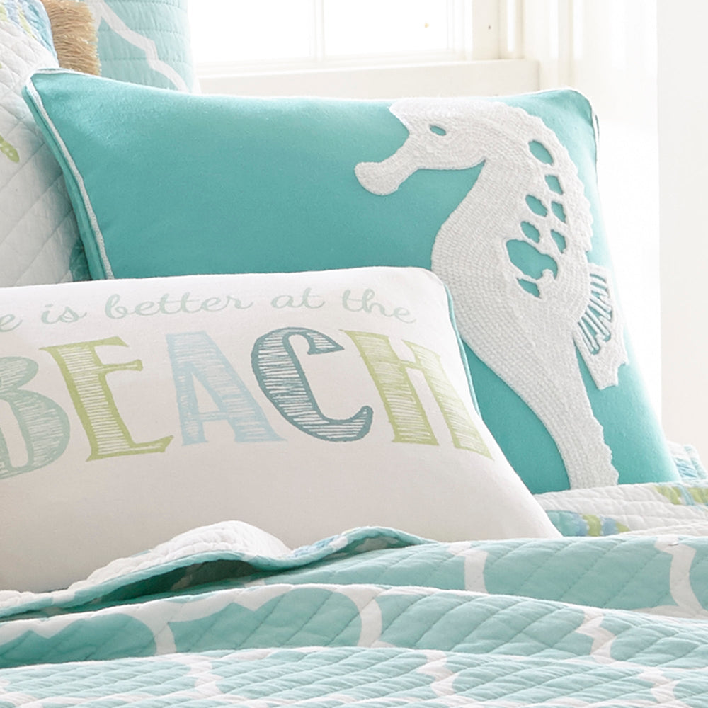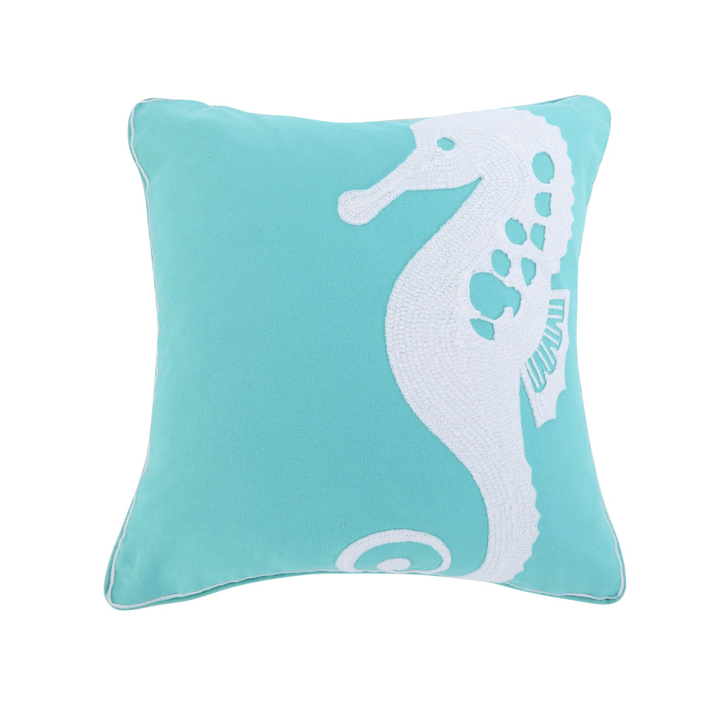 The Seahorse decorative pillow matches perfectly with the Levtex Home Del Ray bedding collection. This pillow is sized at 18x18in. and features a seahorse embroidered with thick white thread on teal ground. The teal and white color palette makes this a versatile accessory for your bed, couch or favorite chair. The pillow comes pre-filled with a soft, luxurious feather inner.