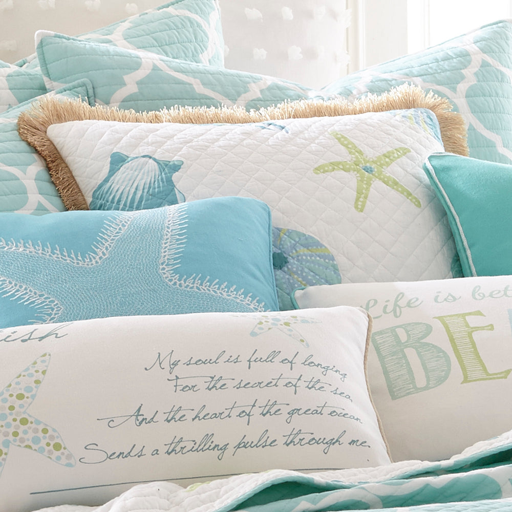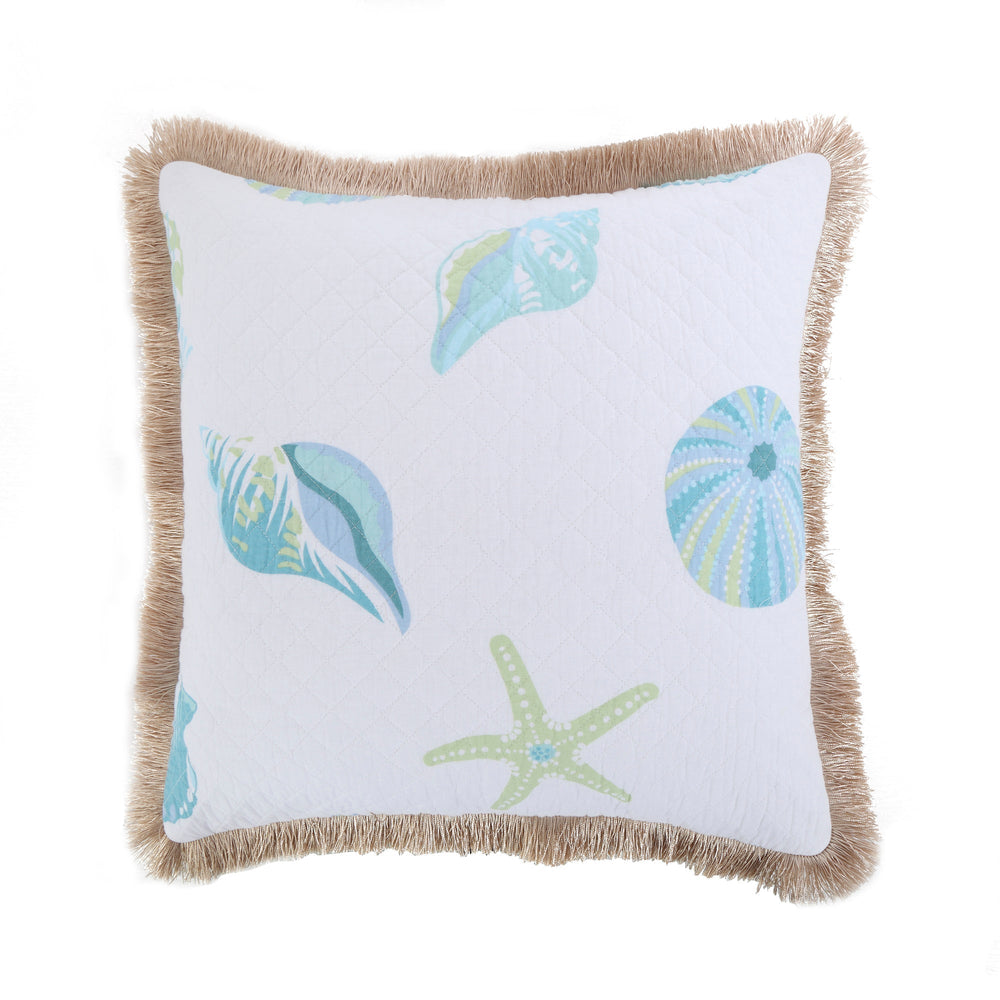 The Quilted Shells Fringe decorative pillow matches perfectly with the Levtex Home Del Ray bedding collection. This pillow is sized at 20x20in. and features a quilted fabric with tossed starfish and shells on white ground, with tan fringe border in complelemnt. The blue, green, tan and white color palette makes this a versatile accessory for your bed, couch or favorite chair. The pillow comes pre-filled with a soft, luxurious feather inner.