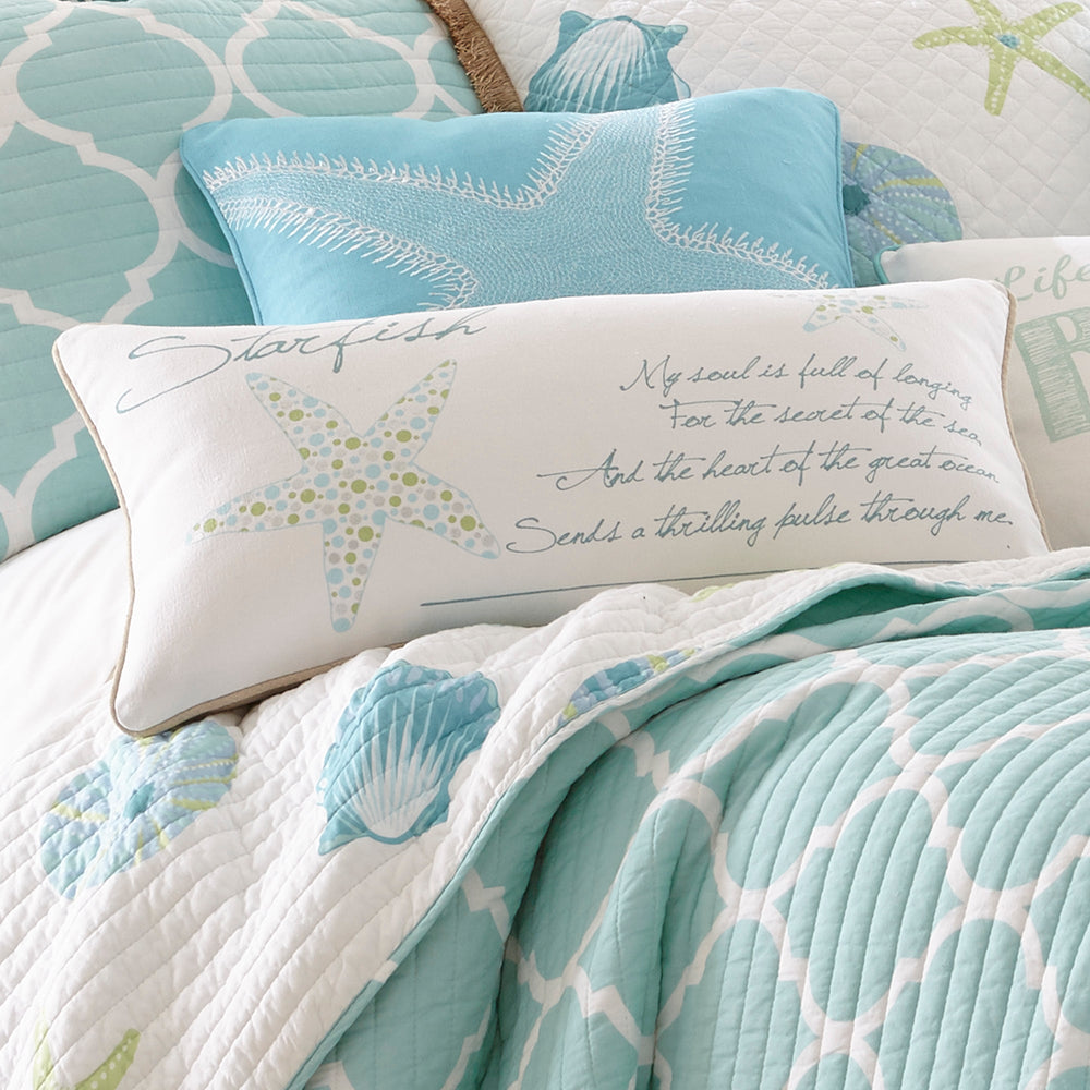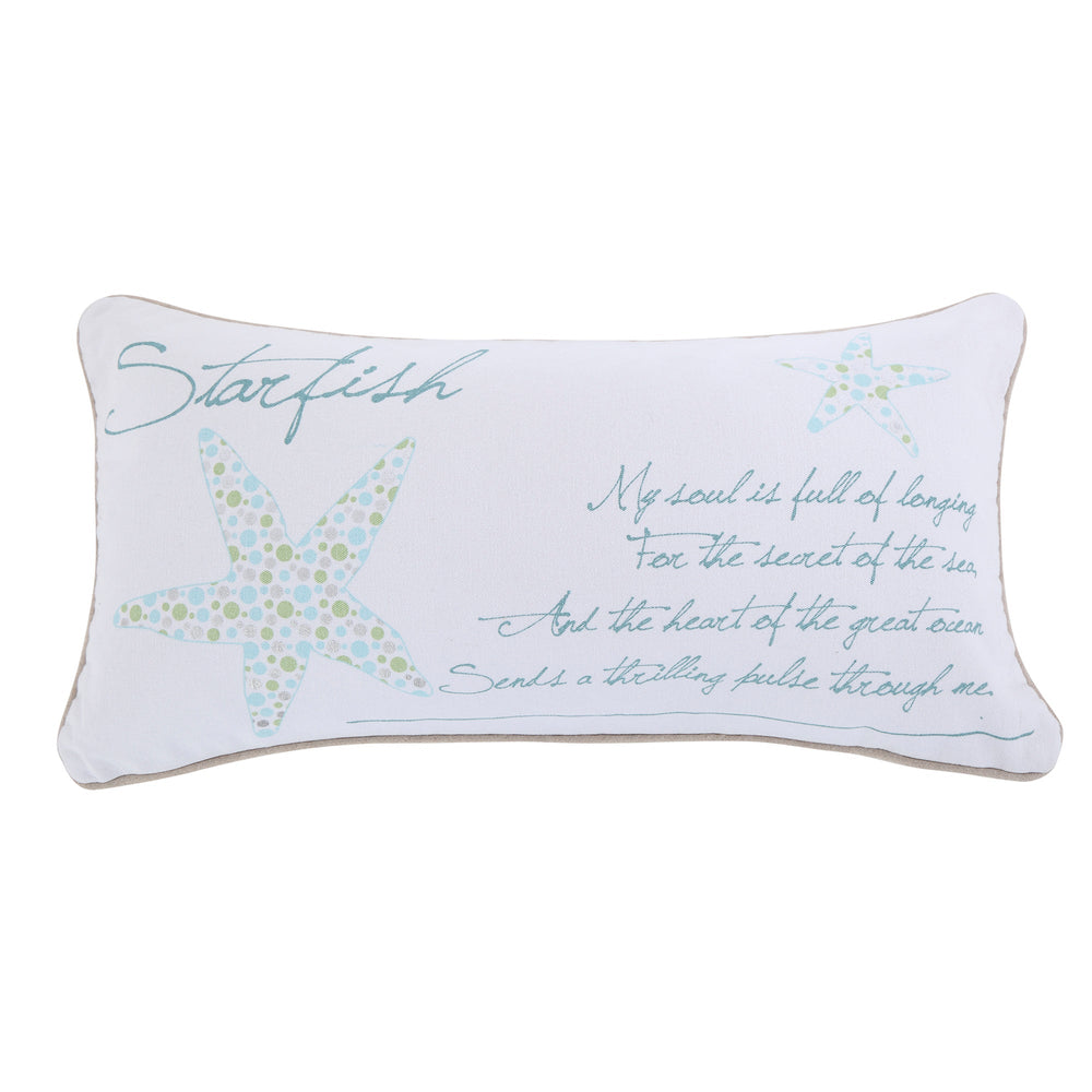 The Starfish Script decorative pillow matches perfectly with the Levtex Home Del Ray bedding collection. This pillow is sized at 12x24in. and features dotted starfish, a tan bound border, the word ‘Starfish’ and an elegant poem, printed in script font on white. The blue, green, tan and white color palette makes this a versatile accessory for your bed, couch or favorite chair. The pillow comes pre-filled with a soft, luxurious feather inner.