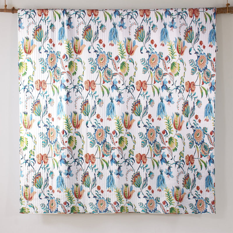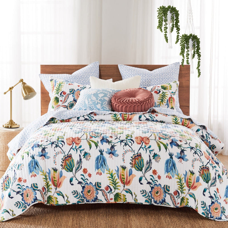 The Eleni Reversible Quilt Set by Levtex Home is inspired by antique French wallpaper. Offered in blue, navy, coral, green and white, this design will immediately transform your bedroom. This reversible quilt features gorgeous vine floral in bright colorful shades on a white ground on the front, reversing to a small stencil style tile design in blue on white ground on the back. The Quilt has a cotton front and back, filled with a cotton-rich filler, is machine washable. Enjoy this for years to come!