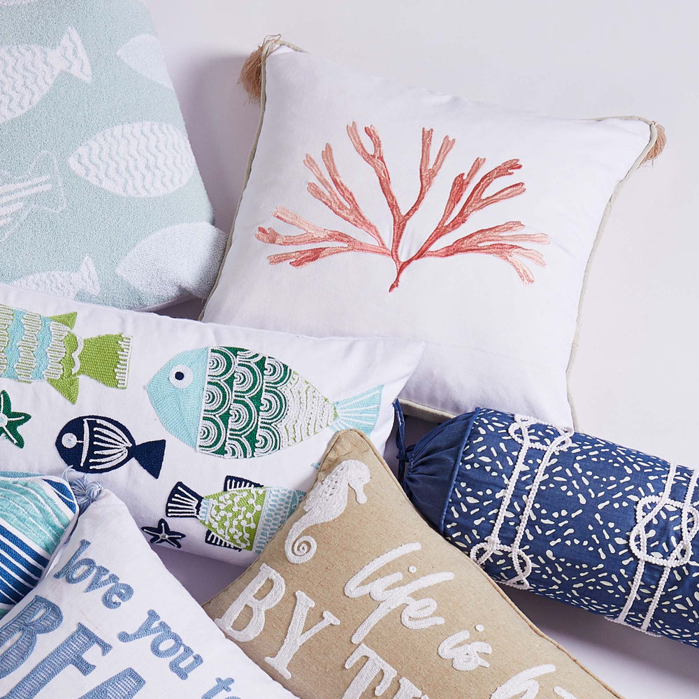 The ‘Embroidered Coral with Tassels’ pillow adds a bright coastal accent to any bedroom or living space. This pillow is sized at 18x18in. and features a bright coral branch embroidered on white ground, with grey borders and blush corner tassels. The pillow comes pre-filled with a soft, luxurious feather inner. The inner is removable, assuring easy care if the pillow cover needs cleaning.