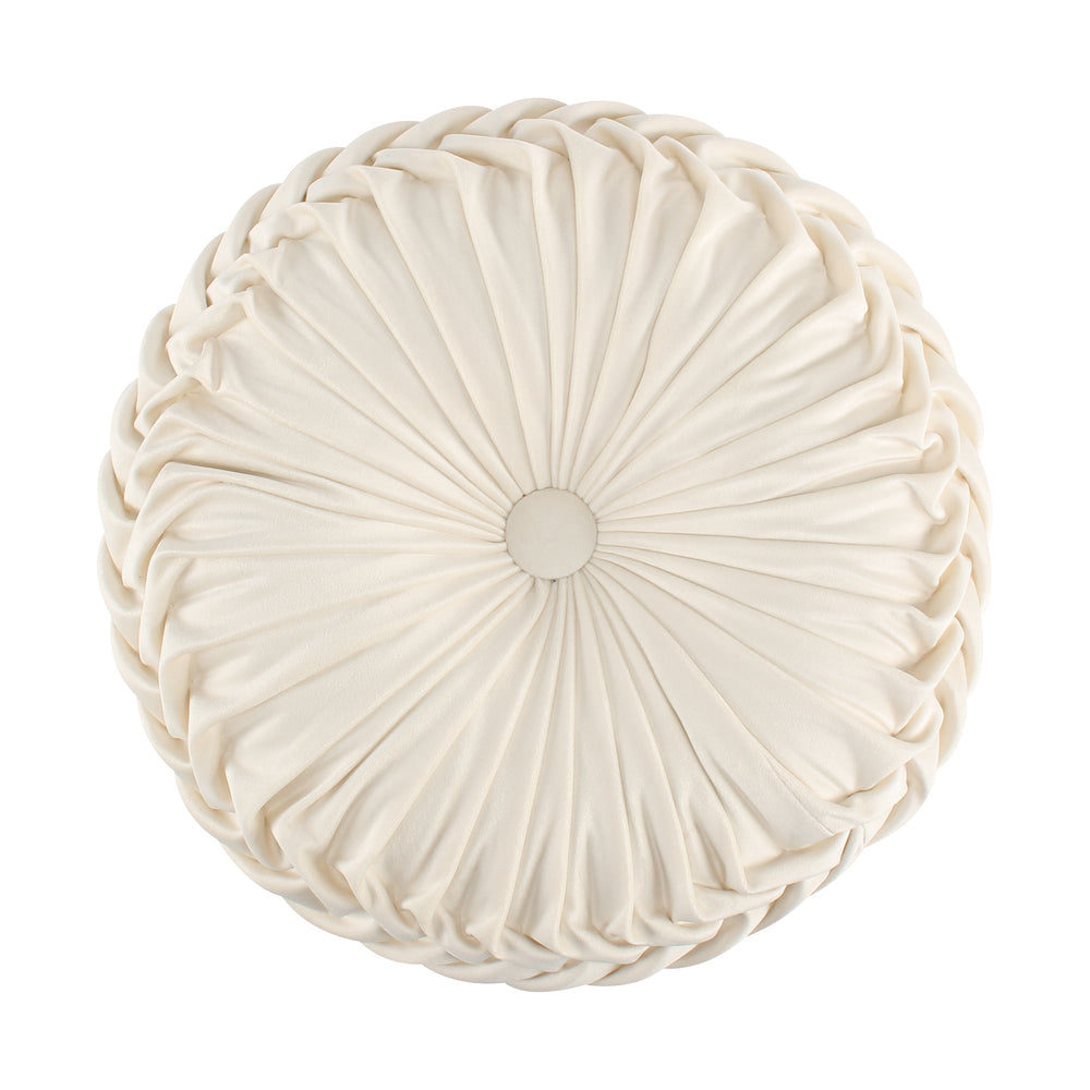 The Velour decorative pillow matches perfectly with the Levtex Home Emel bedding collection. This pillow is sized at 16 in. Round and features soft elegant cream pleaded velour. The color palette makes this a versatile accessory for your bed, couch or favorite chair. The pillow comes pre-filled with a soft, luxurious?polyester inner.