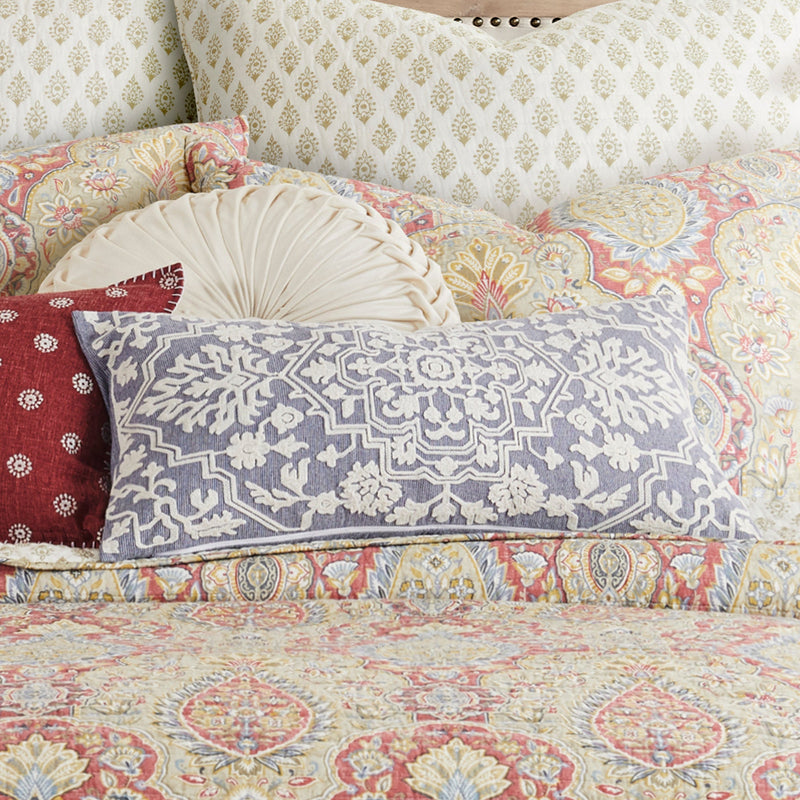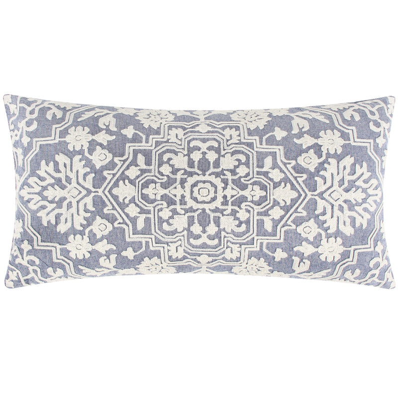 The Embroidered Damask decorative pillow matches perfectly with the Levtex Home Emel bedding collection. This pillow is sized at 12 x 24in. and features intricate damask pattern embroidered in cream on a light blue striped ground. The color palette makes this a versatile accessory for your bed, couch or favorite chair. The pilow comes pre-filled with a soft luxurious feather inner.