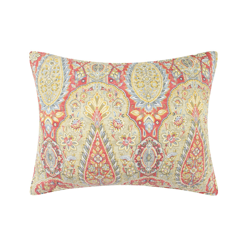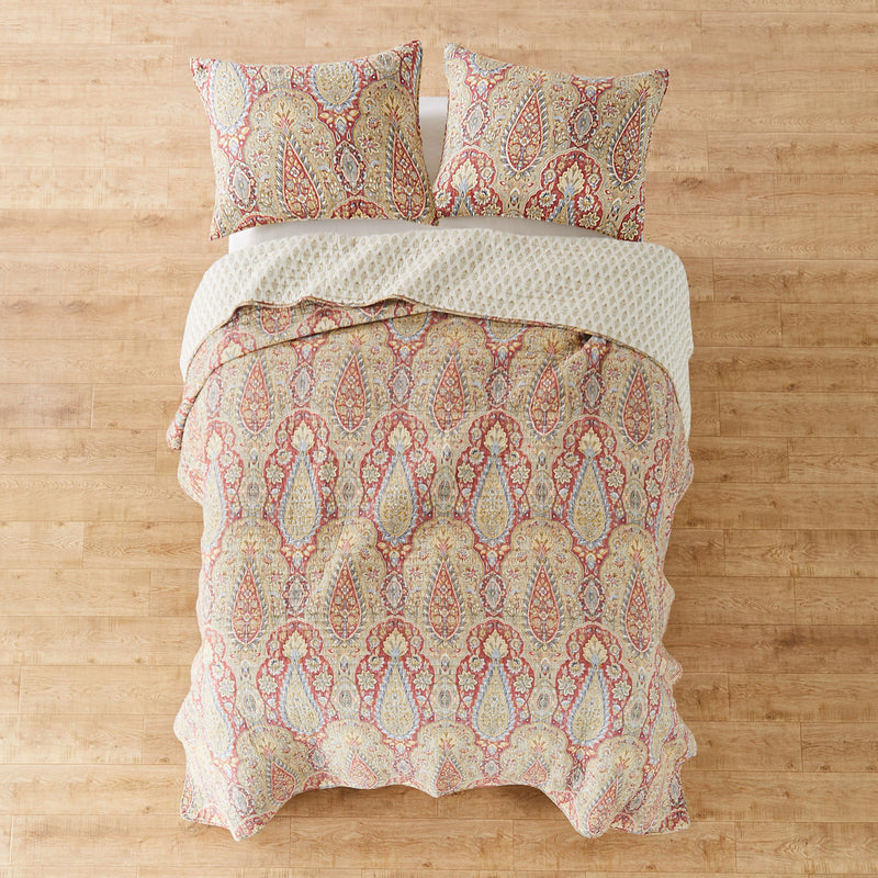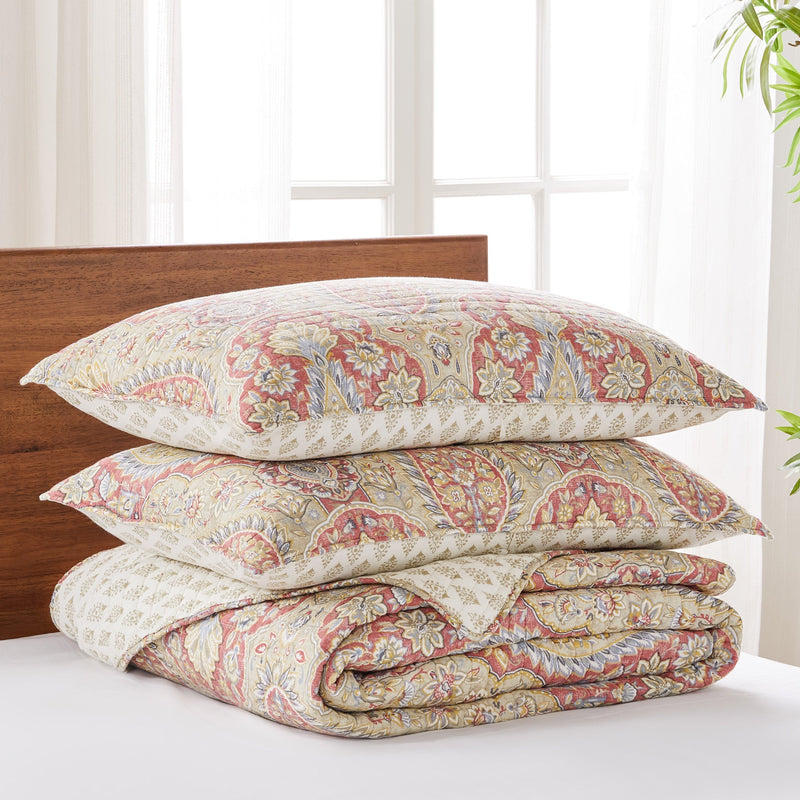 The Emel Reversible Quilt Set by Levtex Home is inspired by stunning ancient tapestries. This damask, medallions and floral design will immediately transform your bedroom. Made with the softest lightweight cotton, this reversible quilt features a intricate damask and medallions in ochre, grey on adobe ground, reversing to a ochre medallions on cream quilt on the other. The Quilt Set is machine washable. Enjoy this for years to come!