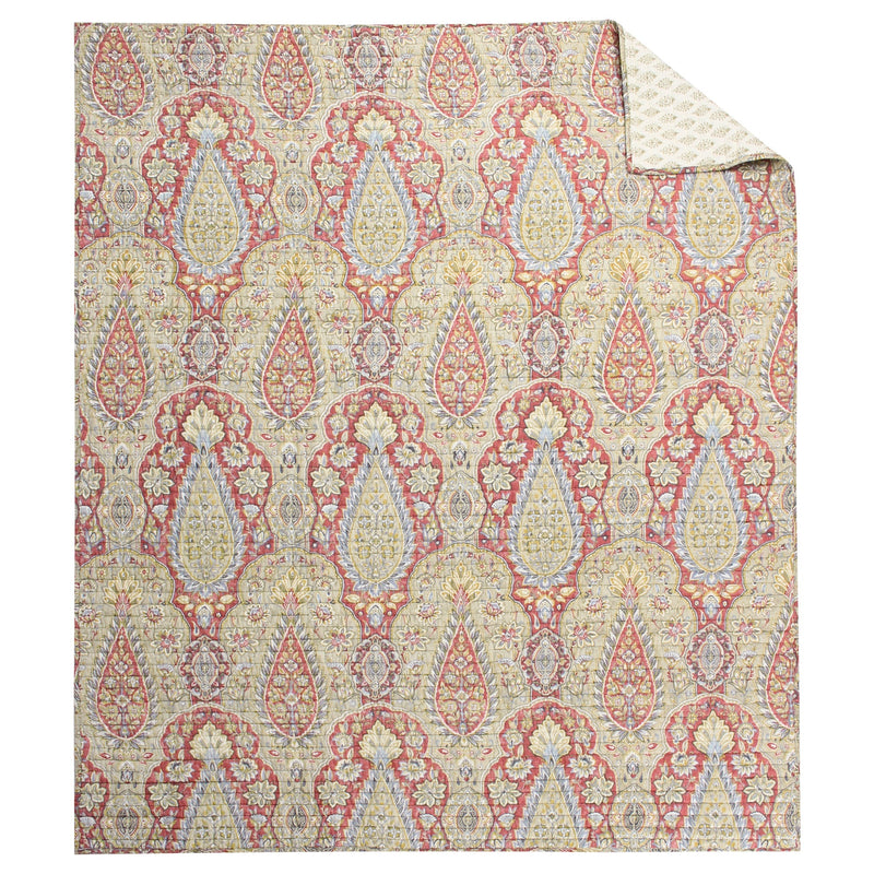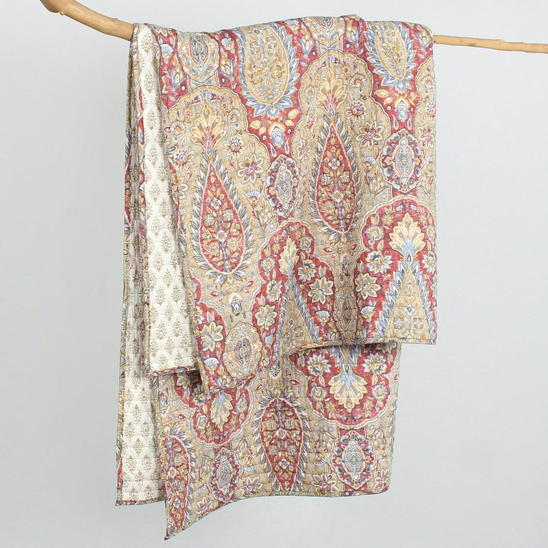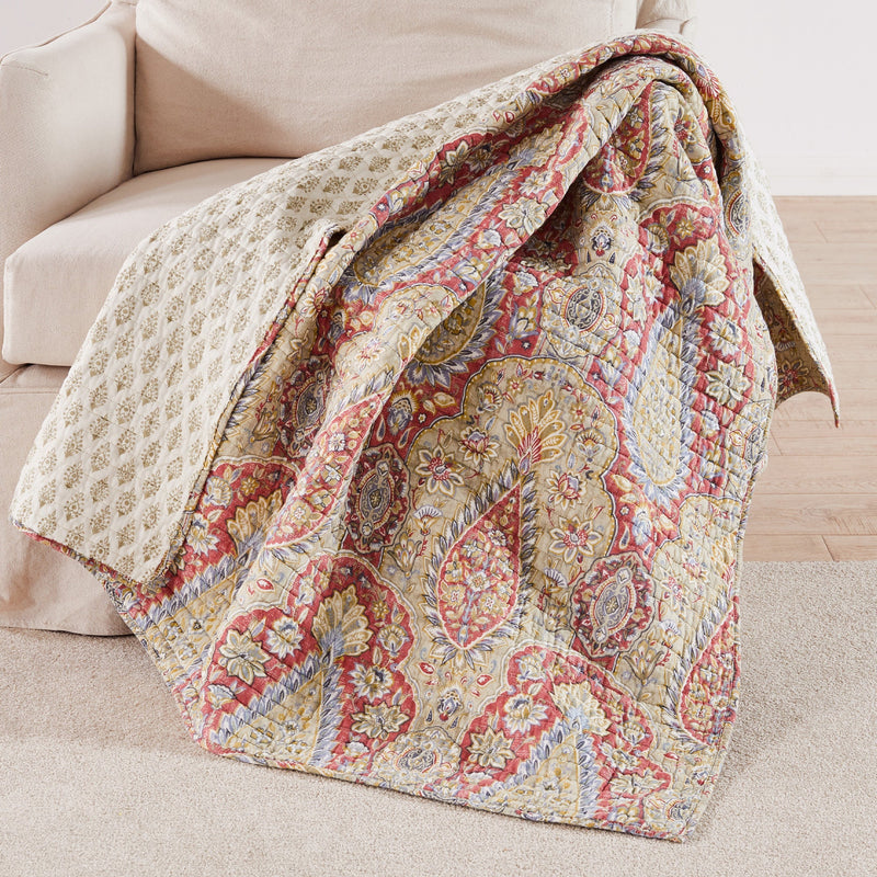 The Emel Reversible Quilted Throw by Levtex Home is inspired by stunning ancient tapestries. This damask, medallions and floral design will immediately transform your bedroom. Made with the softest lightweight cotton, this reversible throw features a intricate damask and medallions in ochre, grey on adobe ground, reversing to a ochre medallions on cream quilt on the other. The Quilted Throw is perfectly sized at 50x60in. and is machine washable. Enjoy this for years to come!