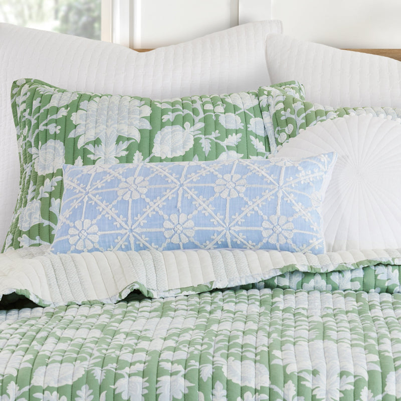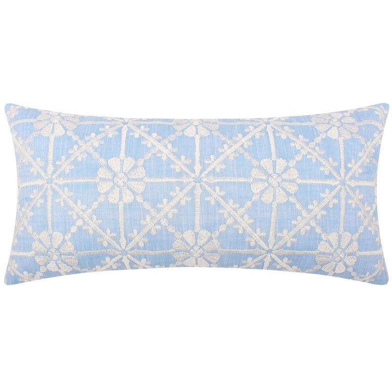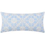The Floral Tile decorative pillow perfectly complements the Levtex Home Evelyn Jacobean bedding collection. This pillow is sized at 12 x 24in. and features an intricately embroidered floral tile pattern in cream on a blue ground. The color palette makes this a versatile accessory for your bed, couch or favorite chair. The pillow comes pre-filled with a soft, luxurious feather inner.