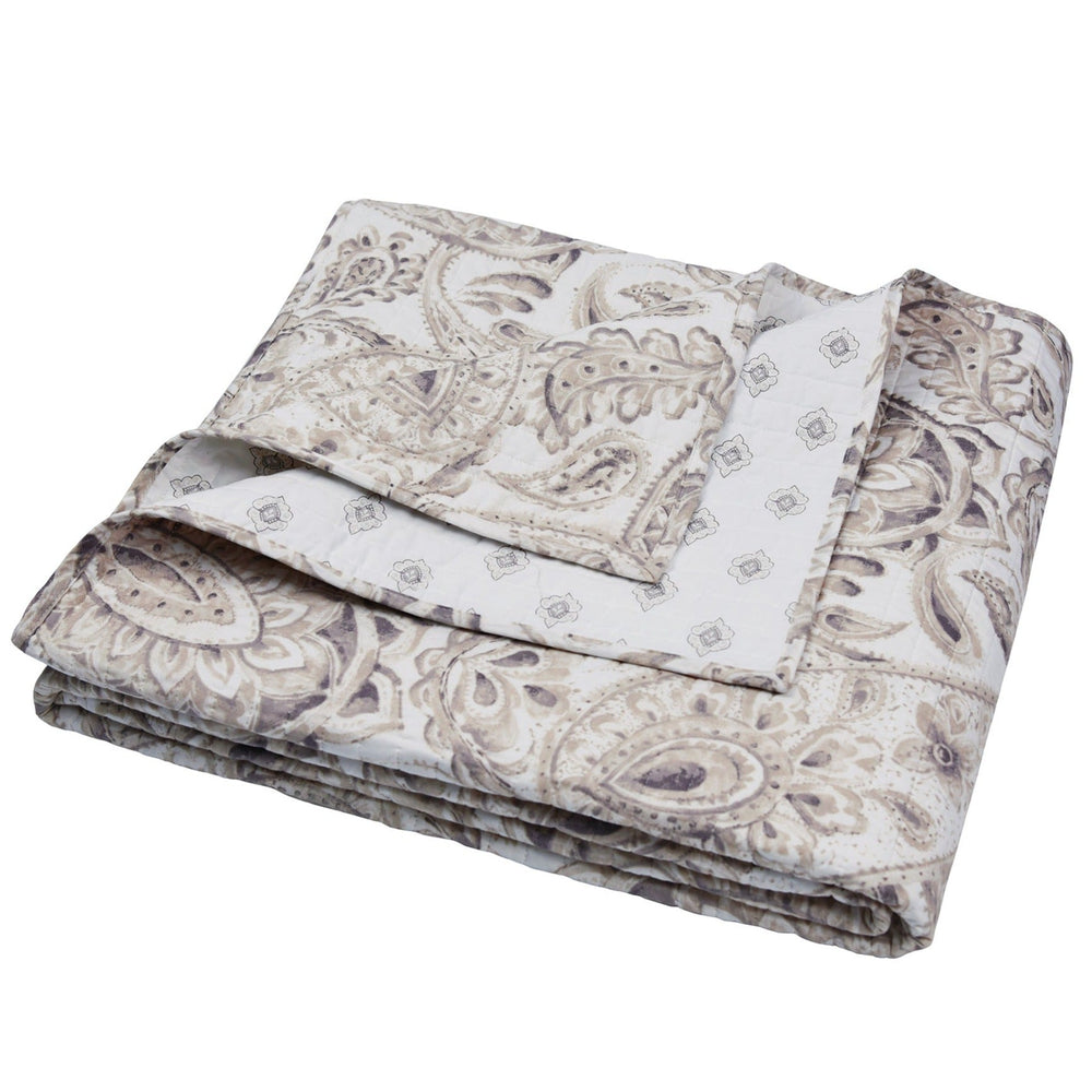 The Fallon Reversible Quilted Throw by Levtex Home is inspired by vintage European wall coverings. This watercolor paisley design will immediately transform your bedroom. Made with the softest lightweight cotton, this reversible throw features an intricate paisley patterns in a swirl of shades of grey on a cream ground, reversing to a grey and white mini medallion on the other. The Quilted Throw is perfectly sized at 50x60in., is machine washable and is filled with a cotton-rich filler (that includes cotton, polyester and other fibers). Enjoy this for years to come!