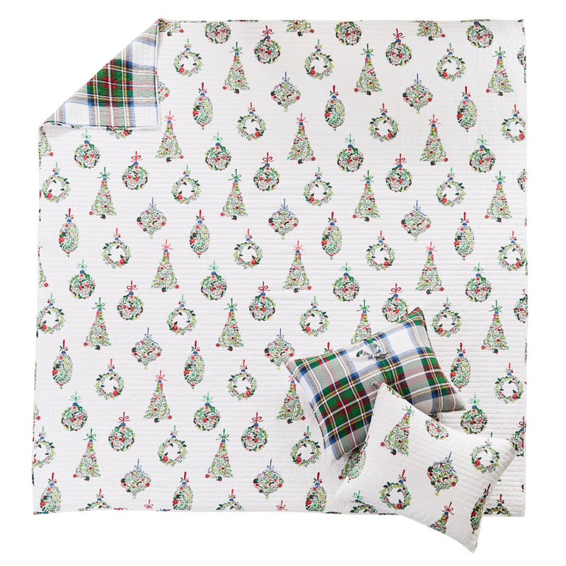 The Festive Baubles Reversible Quilt Set by Levtex Home is inspired by traditional Christmas icons. Offered in classic red, green and white, this design will immediately transform your bedroom. This reversible quilt features a collection of traditional iconic Christmas ornaments on the front, reversing to a a Christmas plaid of green, red, blue and white on the back. The Quilt Set has a cotton front and back, filled with a cotton-rich filler, and is machine washable. Enjoy this for years to come!