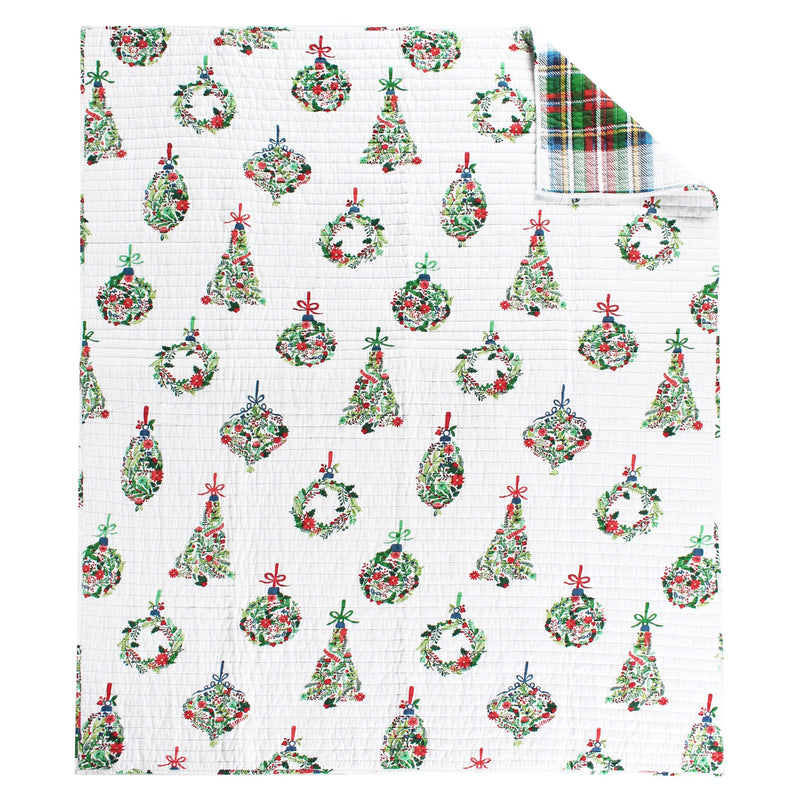 The Festive Baubles Reversible Throw by Levtex Home is inspired by traditional Christmas icons. Offered in classic red, green and white, this design will immediately transform any room in your home. This throw features a collection of traditional iconic Christmas ornaments on the front, reversing to a a Chritmas plaid of green, red, blue and white on the back. The Throw (50x60in.) has a cotton front and back, filled with a cotton-rich filler, and is machine washable. Enjoy this for years to come!