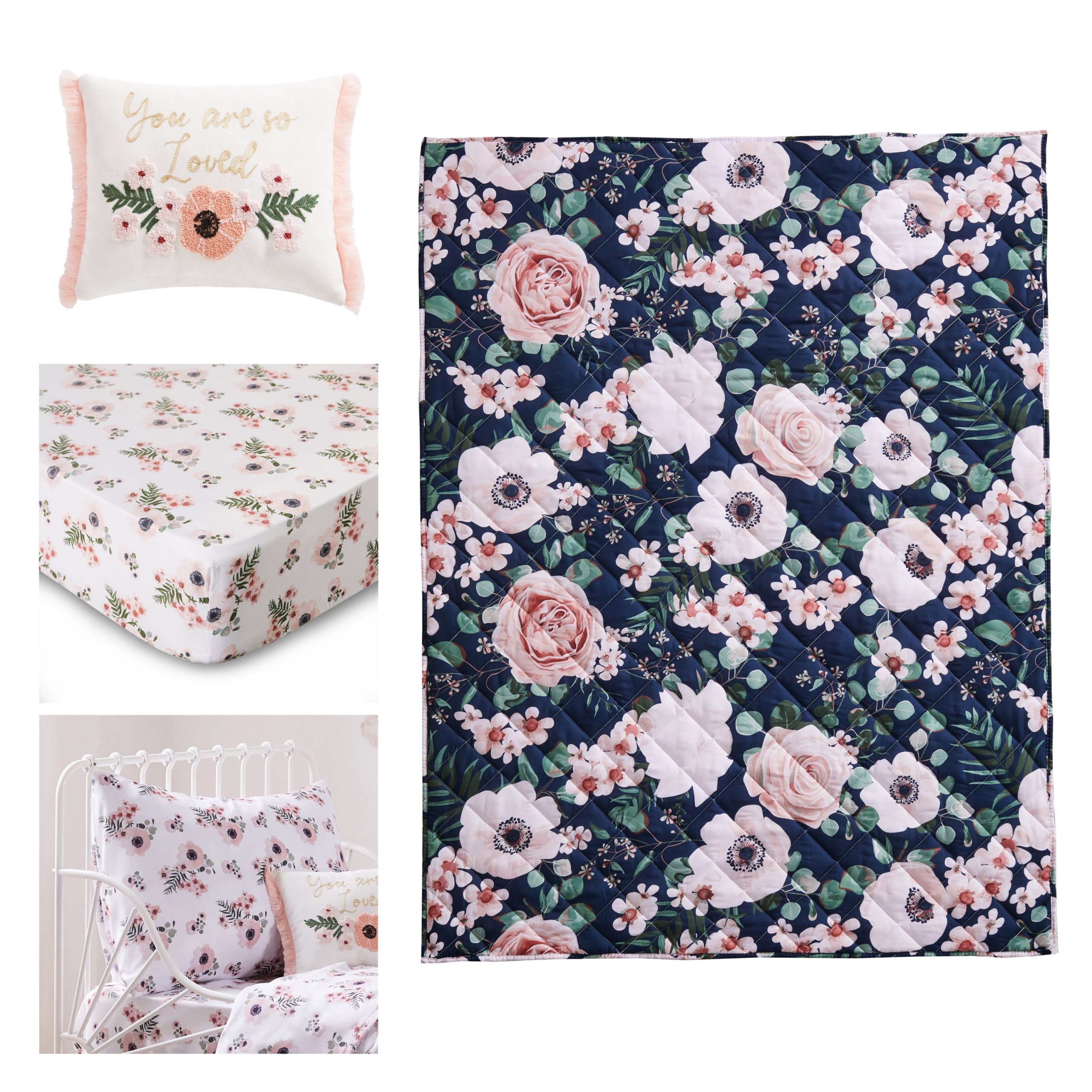 You will think that you are in an English country garden with our adorable floral look. The 5 piece set includes a fitted sheet, a flat sheet and a pillow case that all feature a toss of gorgeous flowers and leaves in blush, pink and black on a white ground; a quilt that is a fully reversible with a bold, oversized dark ground floral pattern on one side and a gorgeous light ground floral on the other; and a decorative pillow that features a crewel stitch floral and the words YOU ARE SO LOVED edged in a blush tassel on two sides. The perfect transition into your first big kid bed.