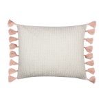 The Textured decorative pillow matches perfectly with the Levtex Home Fiori bedding collection. This pillow is sized at 16 x 20in. and features a rich, slubbed upholstery weight fabric in cream and tan with hints of gold, edged in coral pink tassels on two sides. The color palette makes this a versatile accessory for your bed, couch or favorite chair. The pillows comes pre-filled with a soft luxurious feather inner.