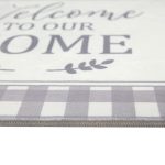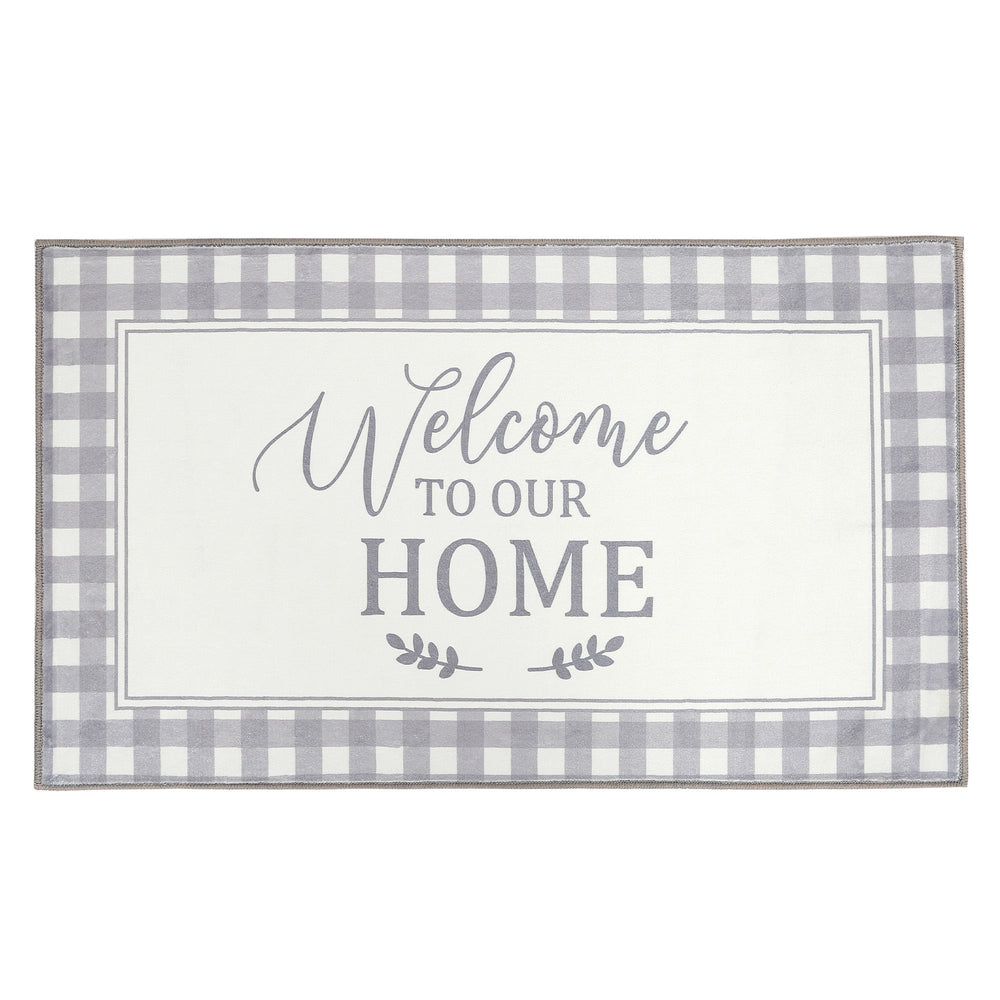The Welcome Home rug complements the Harvest bedding collection, but can be used to accessorize any room in your home. This rug features the words WELCOME TO OUR HOME in grey on a cream ground with a grey plaid border all around. One of our most popular holiday items, this rug is inspired by the cooling temperatures of autumn. The rug is the perfect accessory for any back porch, foyer, laundry room, or room entrance. Made from 100% Polyester, the rug is easy to care for. Sized at 20 x 34 (20in. X 34in.), this rug is the perfect size for a small room, or as an accent piece.