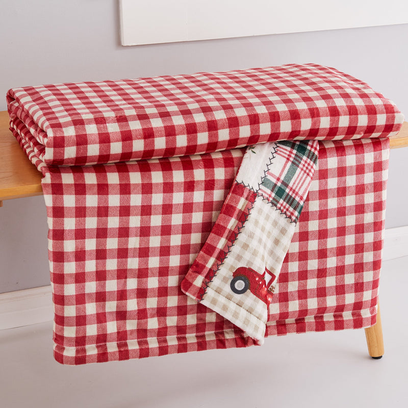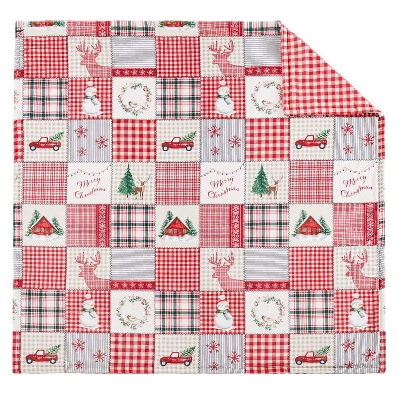 The Home For Christmas Reversible Blanket by Levtex Home is inspired by vintage Christmas patchwork quilts. This design will immediately transform any room into a Christmas wonderland. This reversible, cozy, thick blanket features a beautiful faux patchwork of various Christmas scenes and festive deer on the front, reversing to a a red and cream gingham on the back. The blanket (68x68in.) is polyester and is machine washable. Make this classic a part of your special holiday tradition.