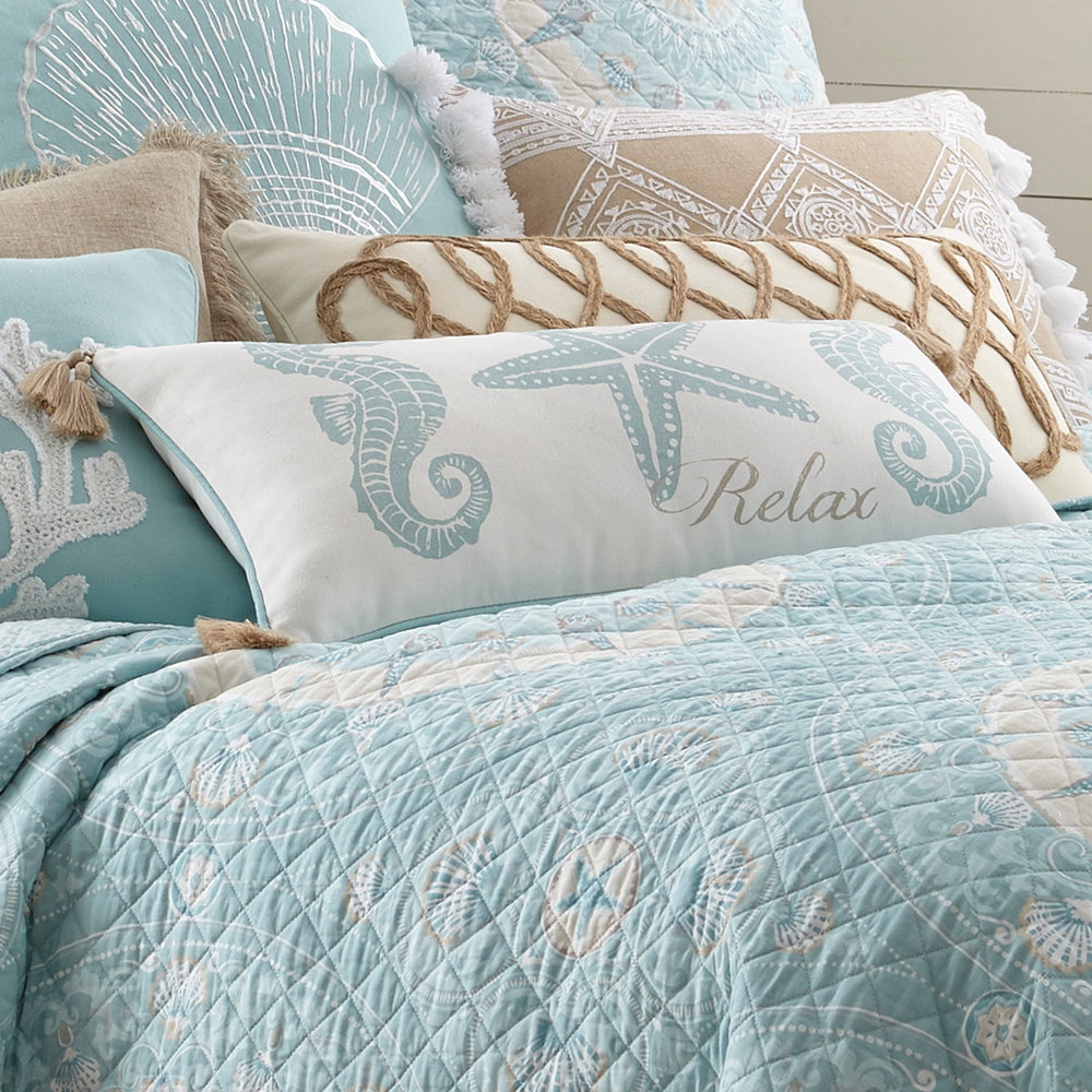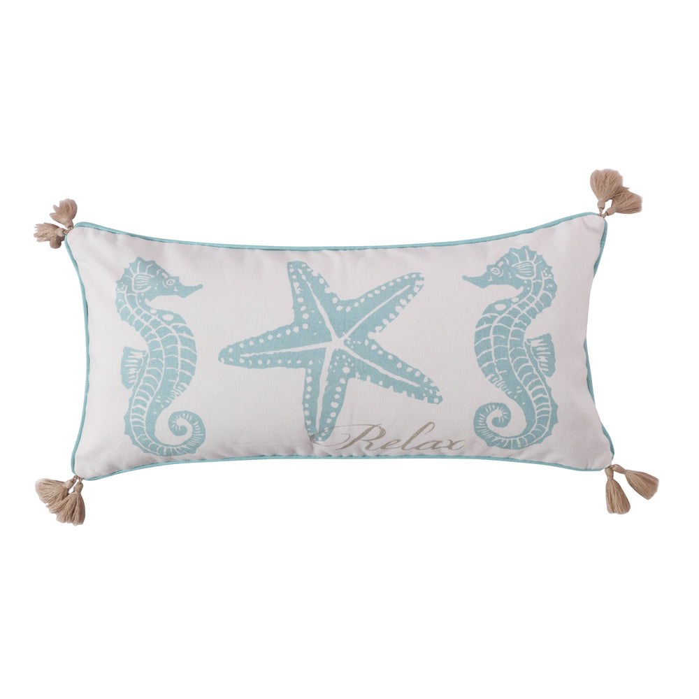 The Relax Starfish decorative pillow matches perfectly with the Levtex Home Blue Bay bedding collection. This pillow is sized at 12x24in. and features two blue seahorses and a starfish, along with the word RELAX, on white ground. Natural color tassels adorn each of the corners. The white, seafoam blue and taupe color palette makes this a versatile accessory for your bed, couch or favorite chair. The pillows comes pre-filled with a soft luxurious feather inner.