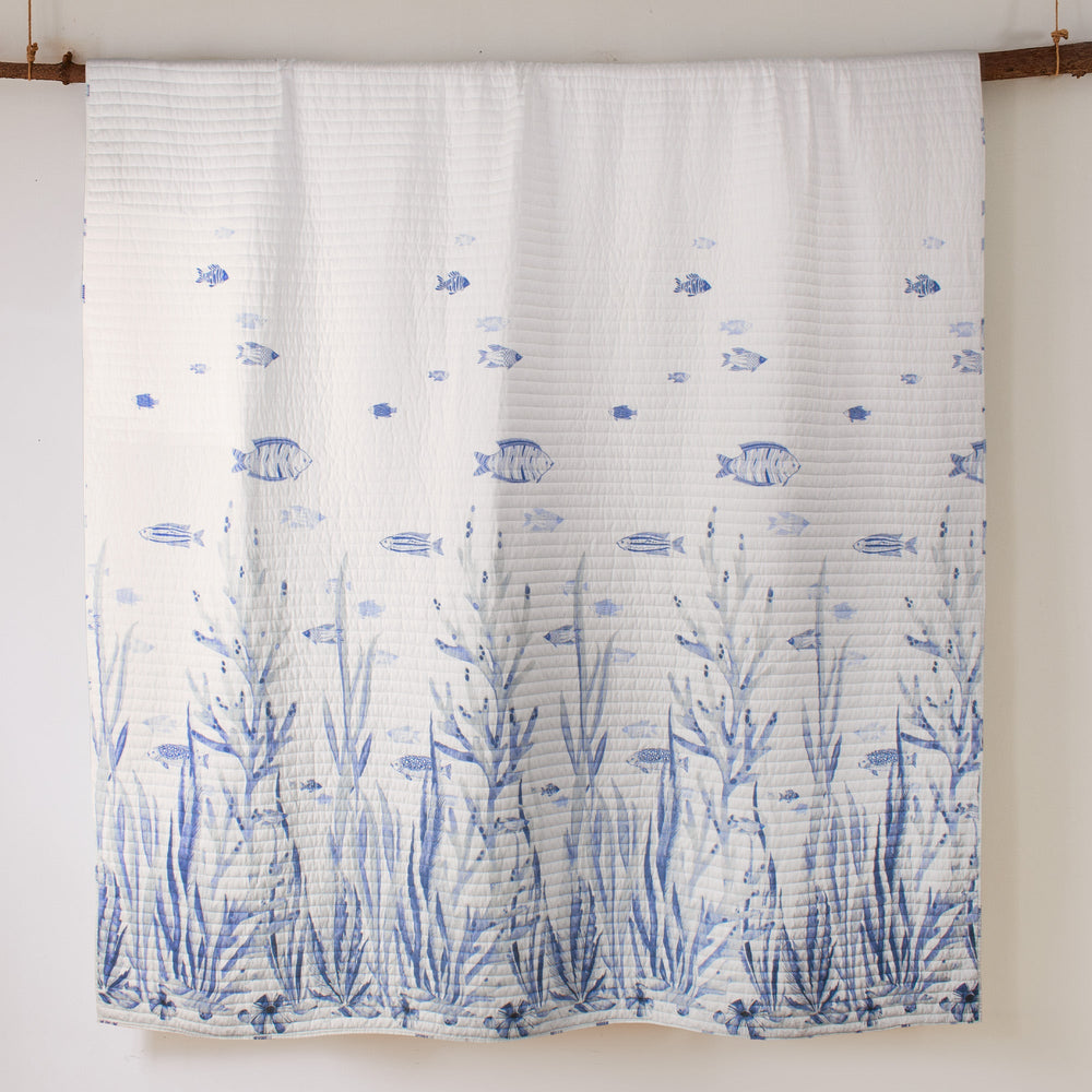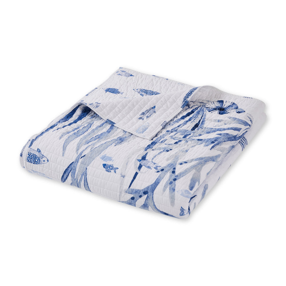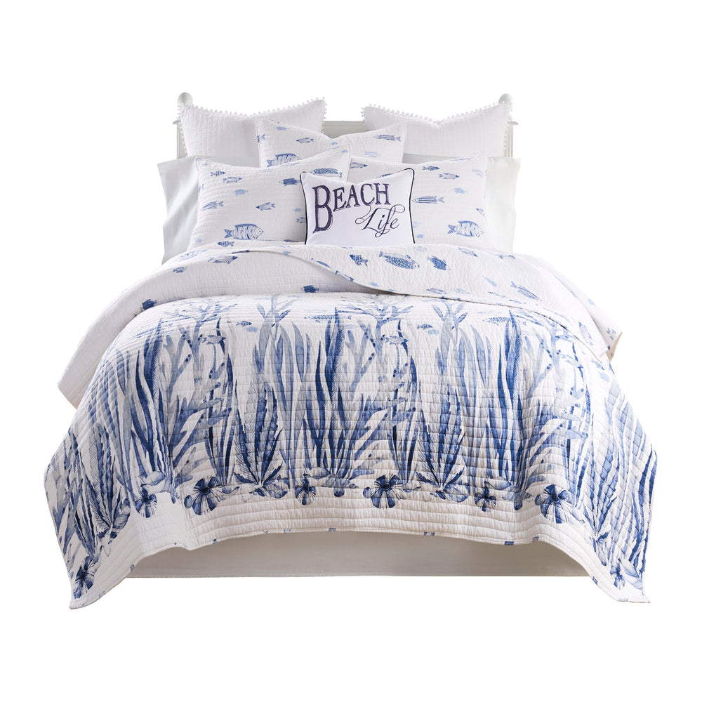 The Indigo Tide Reversible Quilt Set by Levtex Home is inspired by tropical sea life. Offered in navy and white, this design will immediately transform your bedroom. This reversible quilt features a scene of tropical ocean ground filled with sea life on the front, reversing to a wonderful display of swimming tropical fish in navy blue on a white ground on the back. The Quilt Set has a cotton front and back, filled with a cotton-rich filler, is machine washable. Enjoy this for years to come!