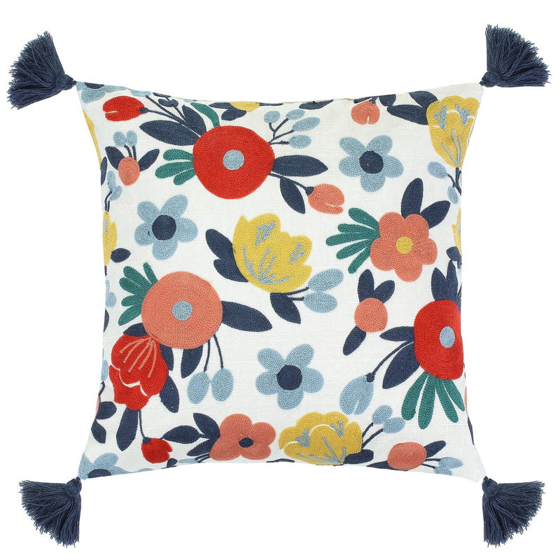 The Flower decorative pillow matches perfectly with the Levtex Home Josephina bedding collection. This pillow is sized at 18 x 18in. and features a rich selection of flowers crewel stitched in Spring colors on a white canvas ground and finished with blue tassels in each corner. The color palette makes this a versatile accessory for your bed, couch or favorite chair. The pillow comes pre-filled with a soft luxurious feather inner.