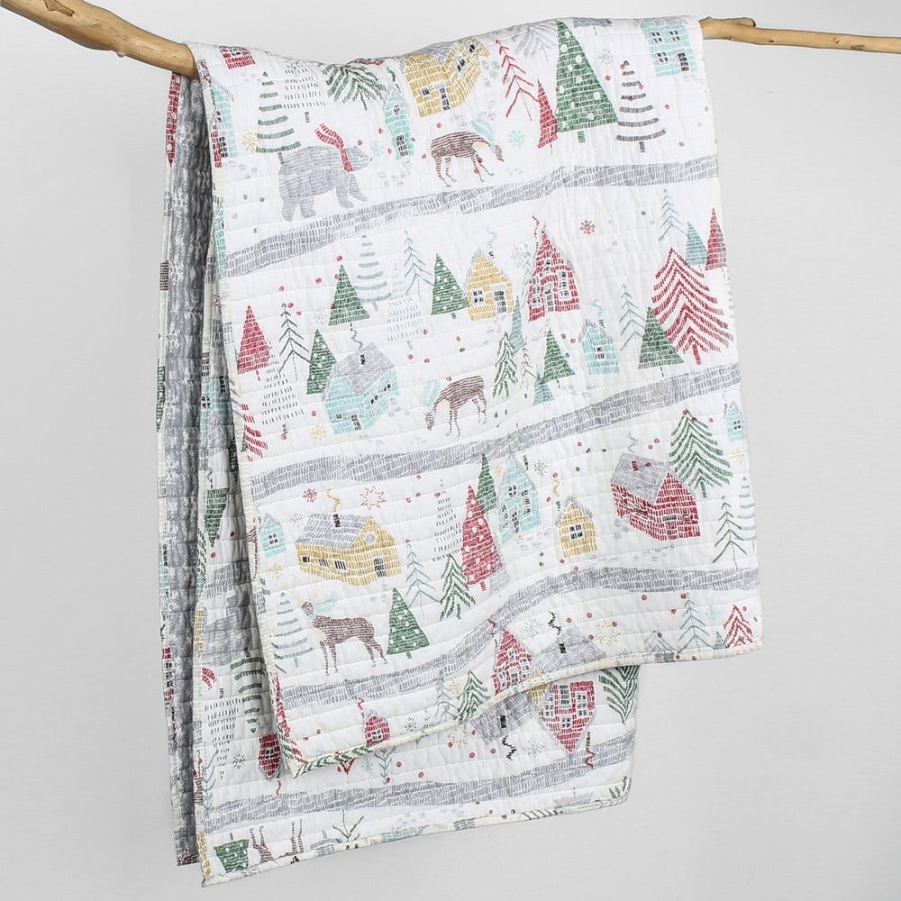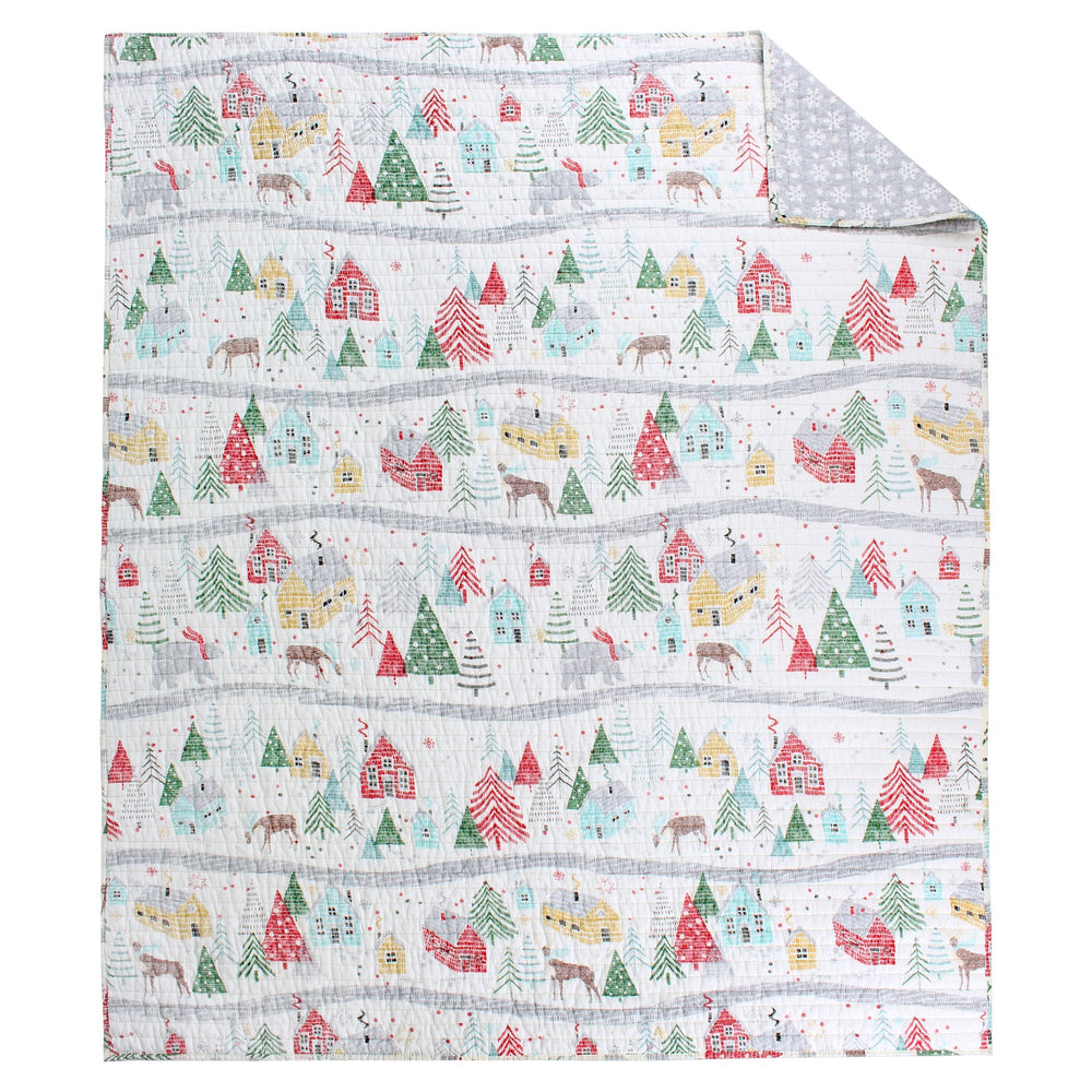 The Joulset Reversible Throw by Levtex Home is inspired by vintage Christmas storybook drawings. Offered in vintage red, green, teal and white, this design will immediately transform any room in your home. This throw features a scenic Christmas holiday in the woods in an sketch, line drawing design on the front, reversing to a small white snowflakes on a grey ground on the back. The Throw (50x60in.) has a cotton front and back, filled with a cotton-rich filler, and is machine washable. Enjoy this for years to come!