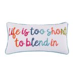 The Life Is Too Short decorative pillow matches perfectly with the Levtex Home Jules bedding collection. This pillow is sized at 12x24in. and features the words LIFE IS TOO SHORT TO BLEND IN embroidered in bright crewel stitch on a white canvas ground and finished with a mini pom edge. The color palette makes this a versatile accessory for your bed, couch or favorite chair. The pillow comes pre-filled with a soft. luxurious feather inner.