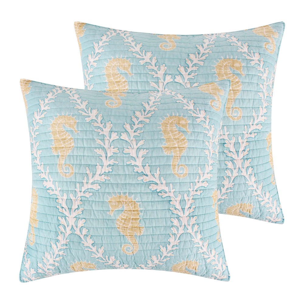 The Kailua Quilted Euro Sham by Levtex Home is inspired by the sand and sea. Offered in blue taupe teal and cream, this design will immediately transform your bedroom. These shams feature seahorses with coral ogee. The Euro Sham (26x26in.) is microfiber, quilted with a cotton rich filler and is machine washable. Pillow inner not included. Enjoy this for years to come!