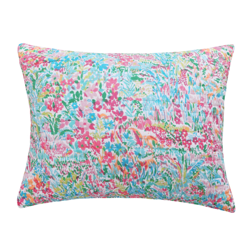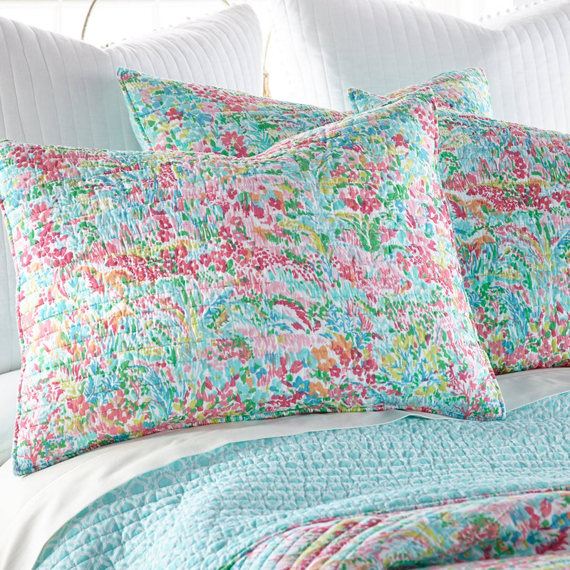 The Karolynna Reversible Quilt Set by Levtex Home is inspired by a bright, dense English country garden. Offered in shades of teal, salmon, green, wild berry floral, this design will immediately transform your bedroom. Made with the softest lightweight cotton and filled with a cotton-rich filler (that includes cotton, polyester and other fibers), this reversible quilt features a bright floral garden design on the one side, reversing to a teal white acorn tile on the other. The Quilt Set is machine washable. Enjoy this for years to come!
