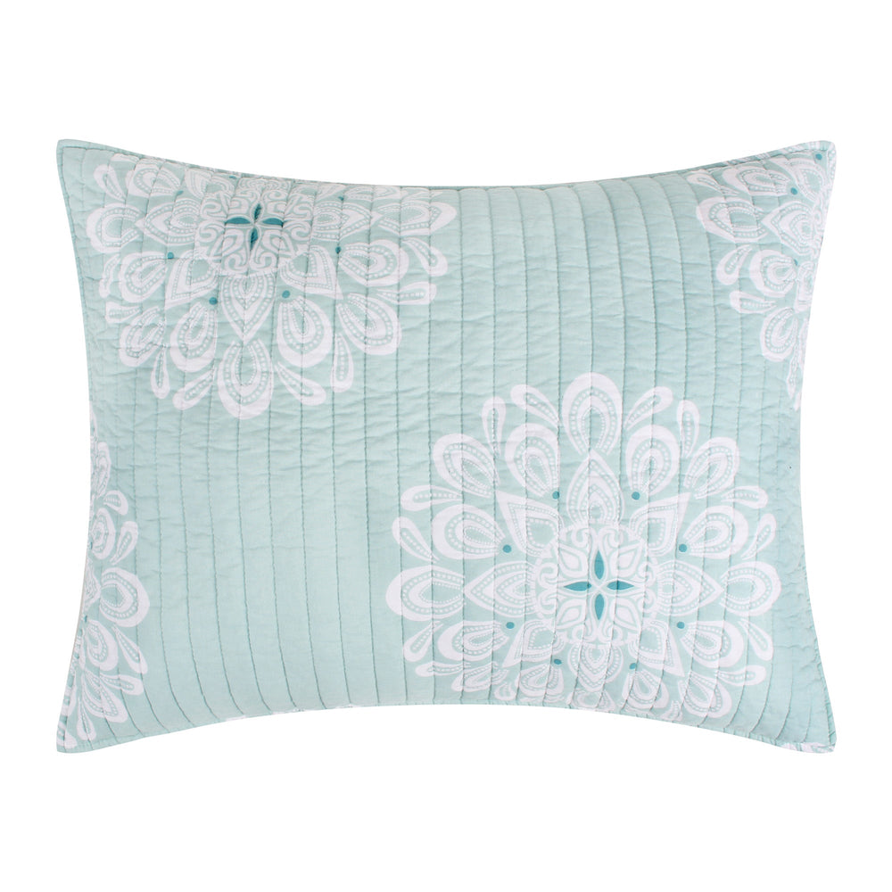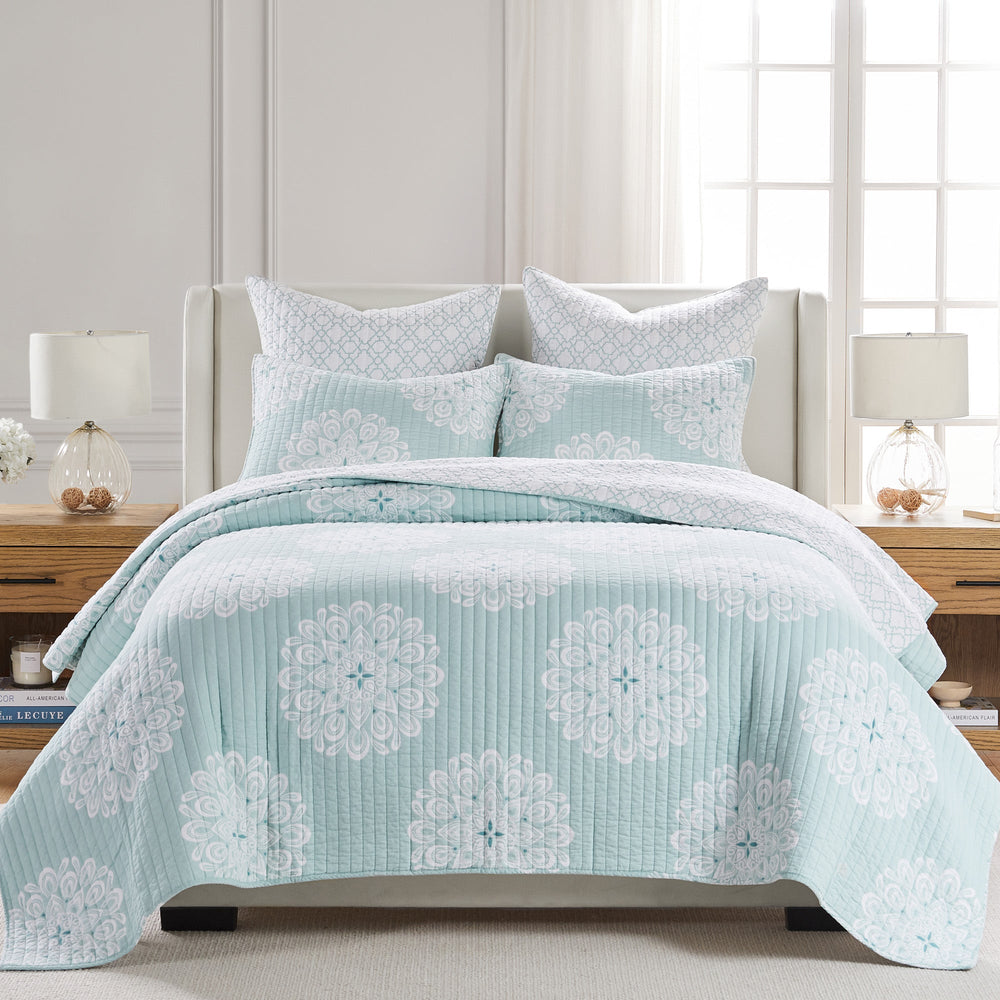 The Lara Spa Reversible Quilt Set by Levtex Home is inspired by classic rosette medallions. Offered in shades of spa blue and white, this design will immediately transform your bedroom. Made with the softest lightweight cotton and filled with a cotton-rich filler (that includes cotton, polyester and other fibers), this reversible quilt features a light, sophisticated round medallion design on the one side, reversing to a spa blue and white geometric on the other. The Quilt Set is machine washable. Enjoy this for years to come!