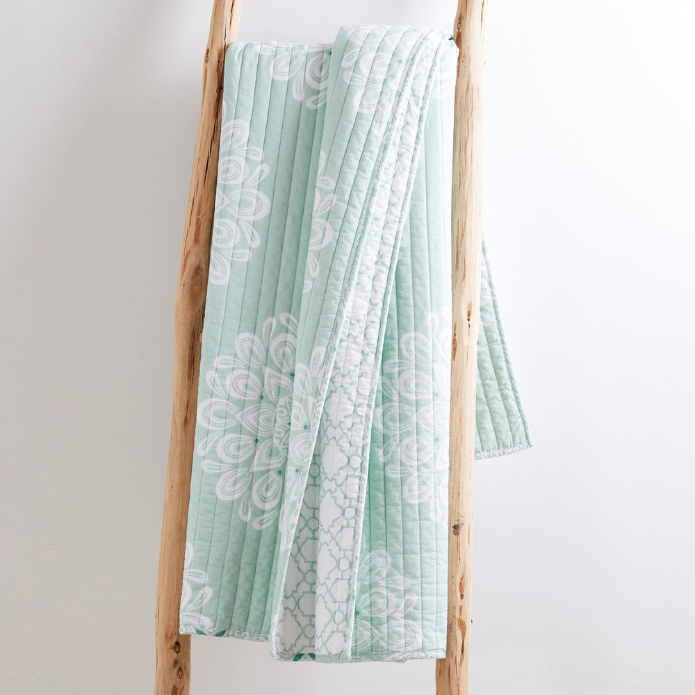 The Lara Spa Reversible Throw by Levtex Home is inspired by classic rosette medallions. Offered in spa and white, this design will immediately transform any room in your home. This throw features round medallions on the front, reversing to a spa and white geometric on the back. The Throw (50x60in.) has a cotton front and back, filled with a cotton-rich filler, and is machine washable. Enjoy this for years to come!