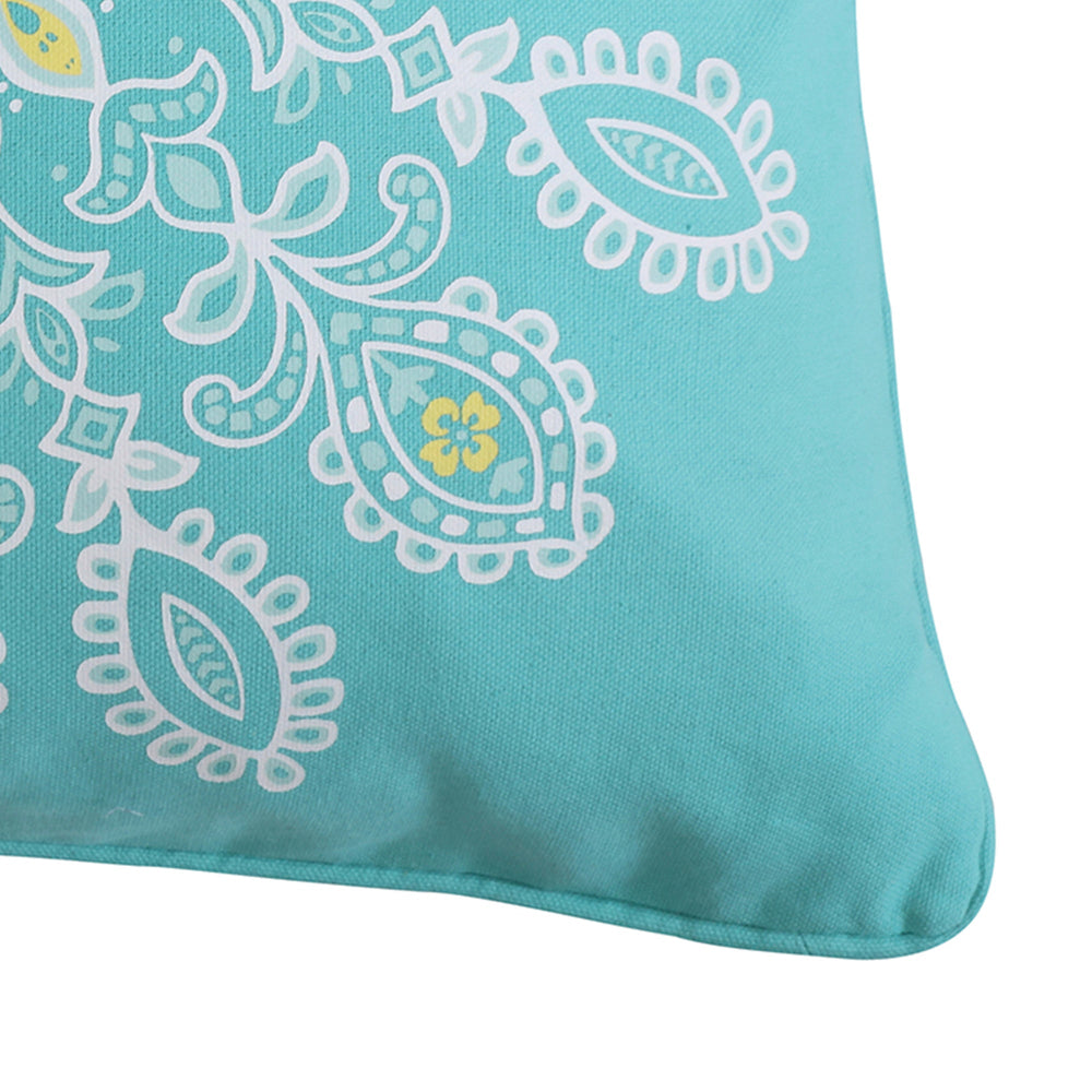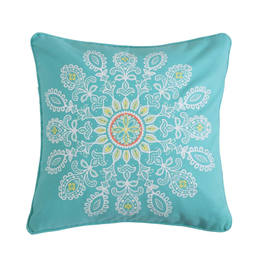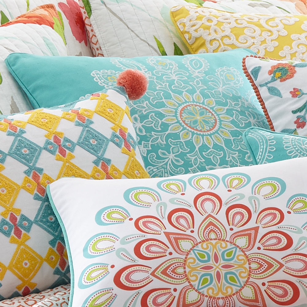 The Medallion decorative pillow matches perfectly with the Levtex Home Laurel bedding collection. This pillow is sized at 18x18in. and features a white and yellow floral medallion screenprinted on a teal canvas ground. The sophisticated color palette makes this a versatile accessory for your bed, couch or favorite chair. The pillow comes pre-filled with a soft, luxurious feather inner.