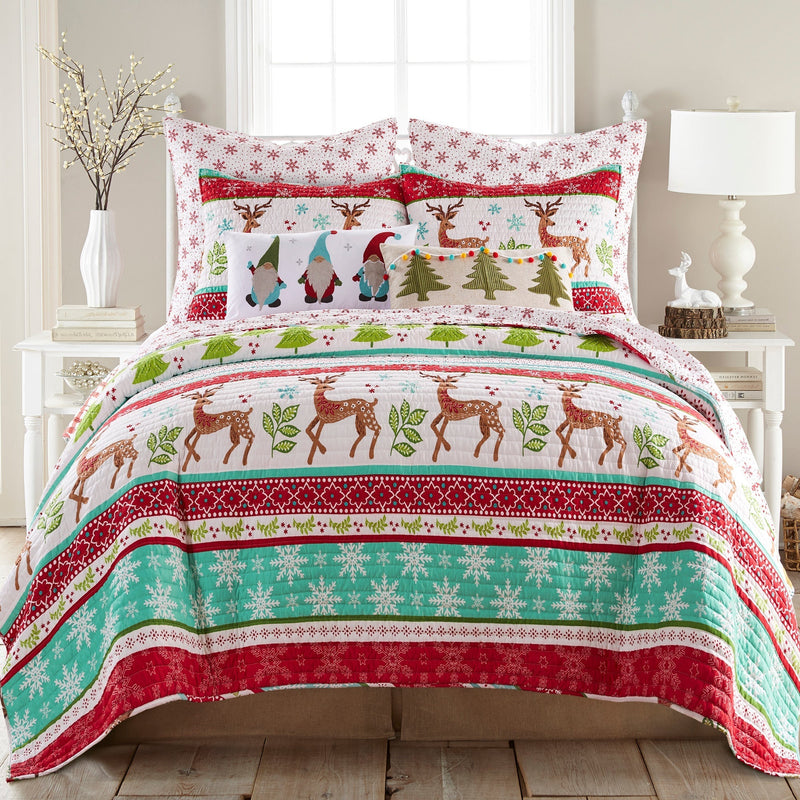 The Let It Snow Reversible Quilt Set by Levtex Home is inspired by memories of a bright and festive Christmas. Offered in shades of red, turquoise, green and white, this design will immediately transform your bedroom. Made with the softest lightweight brushed microfiber, this reversible quilt features rows of Christmas trees, snowflakes and reindeer on the front, reversing to a red snowflakes on a white background on the other. The Quilt Set is filled with a cotton-rich filler (that includes cotton, polyester and other fibers) and is machine washable. Bring the holidays home!