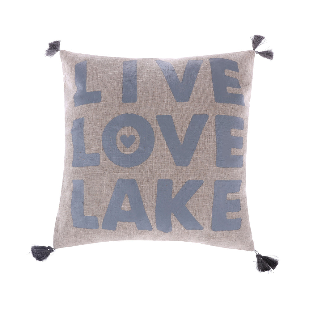 The ‘Live Love Lake’ pillow adds a relaxing touch to any bedroom or living space. This pillow is sized at 20x20in. and features the sentiment ‘LIVE LOVE LAKE’ printed with a soft blue color and a neutral ground. This pillow is further decorated with stylish grey tassled edges. The pillow comes pre-filled with a soft, luxurious feather inner. The inner is removable, assuring easy care if the pillow cover needs cleaning.