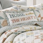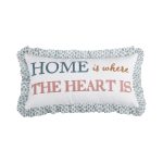 The Ruffle decorative pillow matches perfectly with the Levtex Home Lottie bedding collection. This pillow is sized at 12x24in. and features the words HOME IS WHERE THE HEART IS embroidered in various colors on a white ground with a ruffle all around. The green, teal, ochre white and sienna color palette makes this a versatile accessory for your bed, couch or favorite chair. The pillow comes pre-filled with a soft, luxurious feather inner.