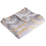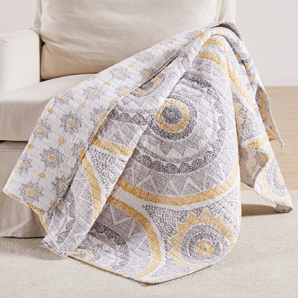 The Luiza Ochre Reversible Quilted Throw by Levtex Home is inspired by beautiful mandalas. This big mandalas design will immediately transform your bedroom. Made with the softest lightweight cotton, this reversible throw features grey with yellow medallions, reversing to a grey with yellow small icons on the other. The Quilted Throw is perfectly sized at 50x60in., is machine washable and is filled with a cotton-rich filler (that includes cotton, polyester and other fibers). Enjoy this for years to come!