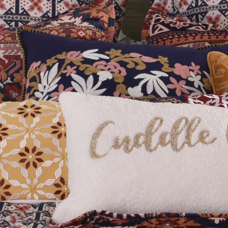 The Crewel Flower decorative pillow matches perfectly with the Levtex Home Madera bedding collection. This pillow is sized at 20x20in. and features a delicately detailed flower design crewel-stitched in coral, white and gold on a navy ground. Complemented with a bound border in gold stitching for contrast. The sophisticated color palette makes this a versatile accessory for your bed, couch or favorite chair. The pillow comes pre-filled with a luxurious polyester inner.