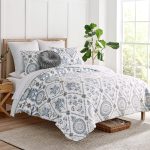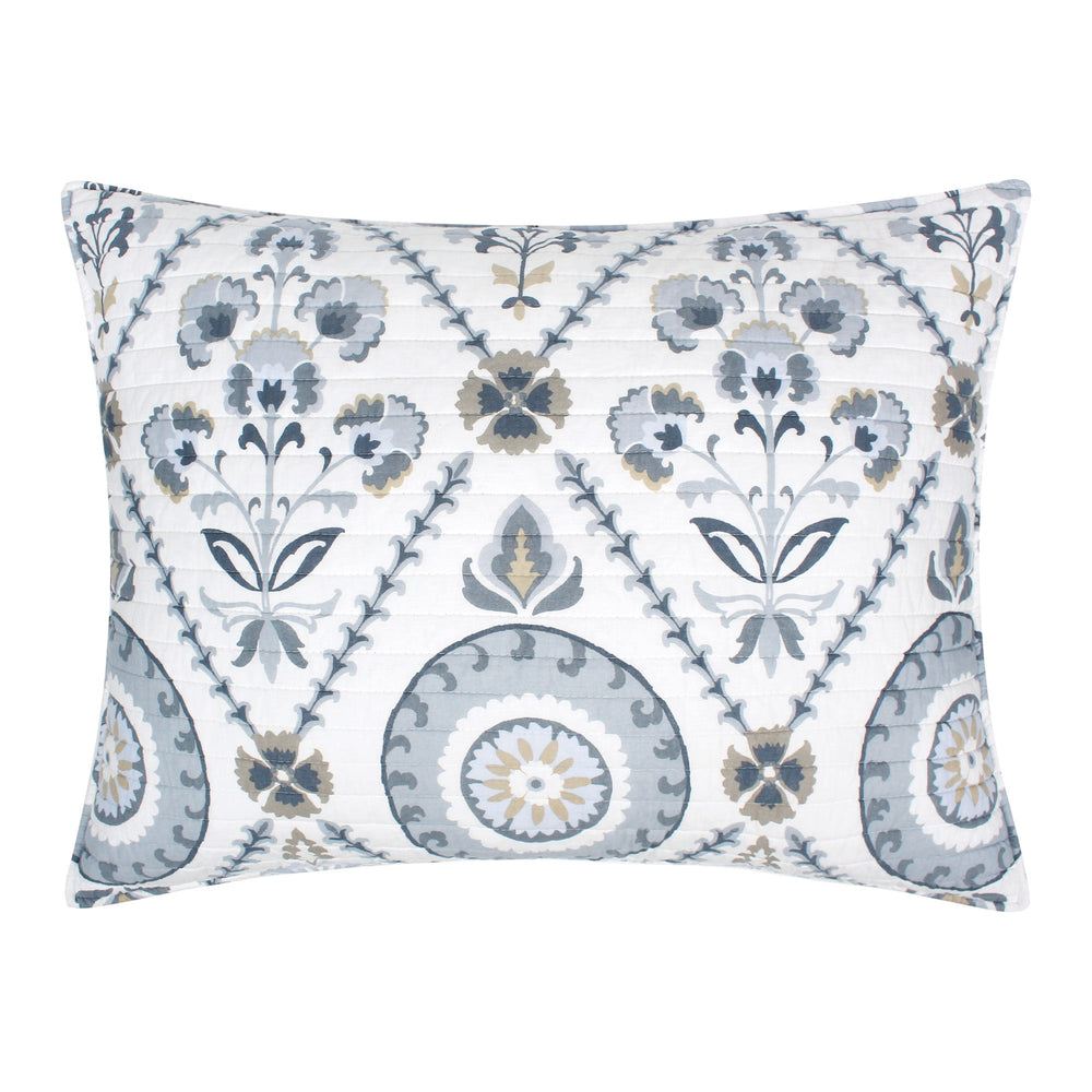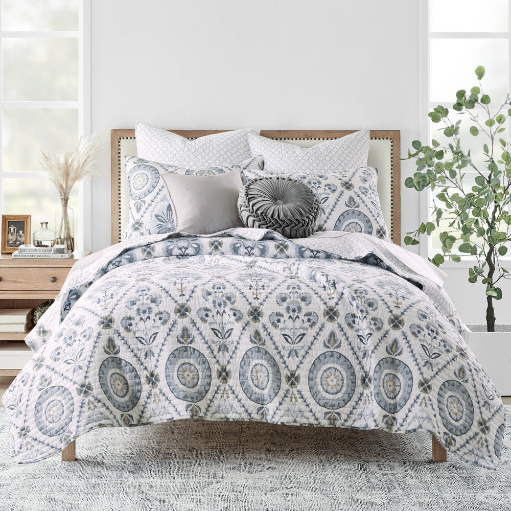 The Maeve Neutral Reversible Quilt Set by Levtex Home is inspired by antique European wallcoverings and tapestries. Offered in blue grey, taupe, charcoal and cream, this design will immediately transform your bedroom. This reversible quilt features a collection of medallions and fleurs offset with a distinctive vine tile on the front, reversing to a small blue grey tile cross print on a cream ground on the back. The Quilt Set has a cotton front and back, filled with a cotton-rich filler, and are machine washable. Enjoy this for years to come!